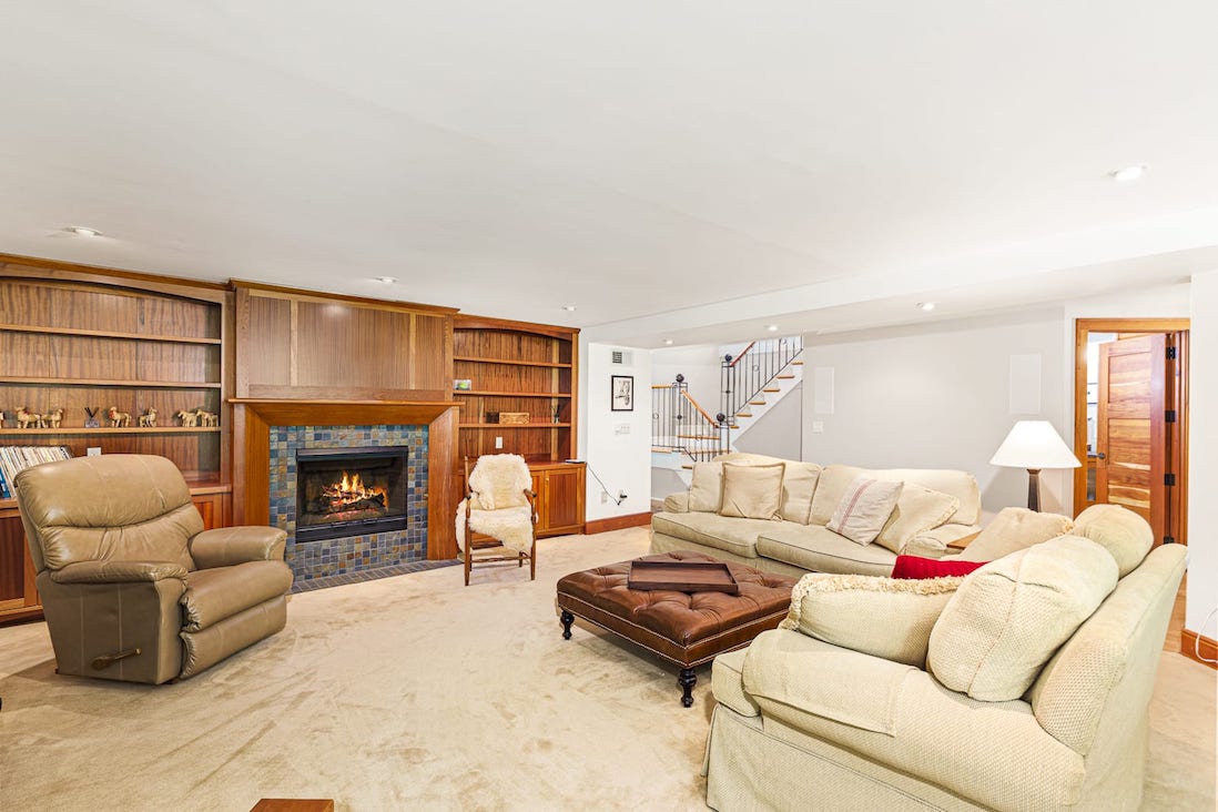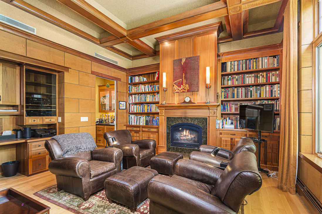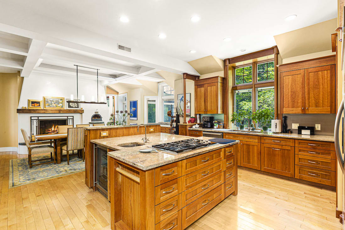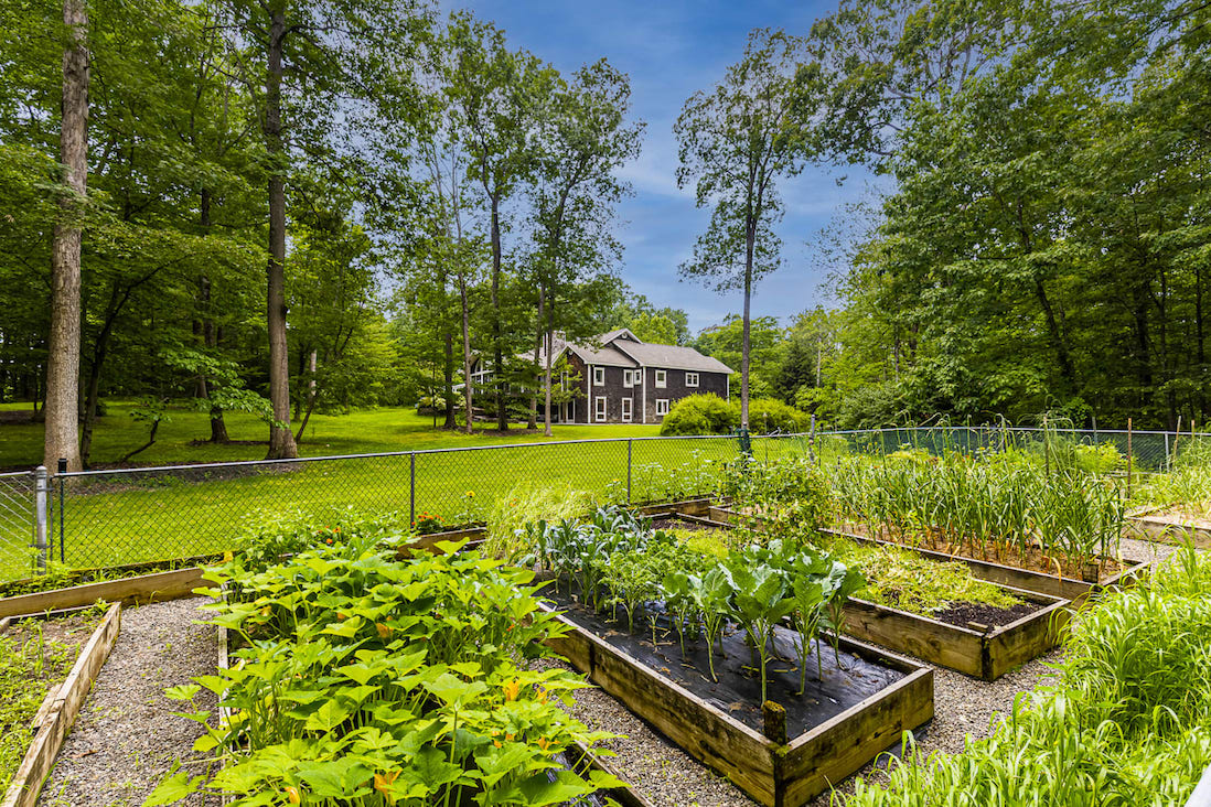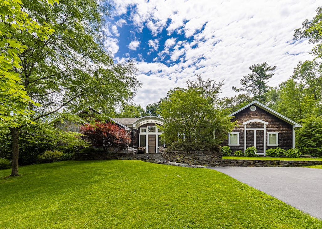 An Arts and Crafts-style residence is sited on 16 acres of woods, mature gardens and open fields. There are three bedrooms and four bathrooms, a library, chef's kitchen, and a heated sunroom. The lower level of the house is self contained with a large family room, bath, office, kitchenette and wine cellar. Listed at $1,825,000 by Corcoran Country Living.