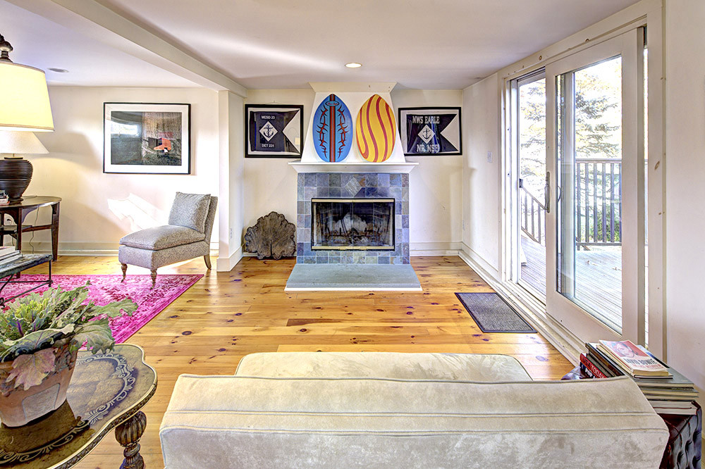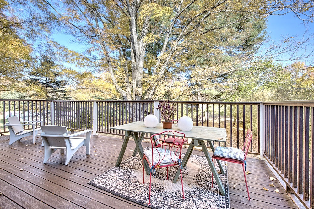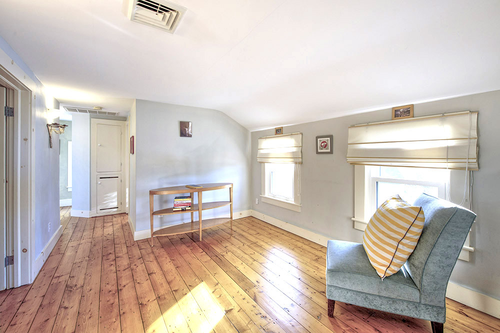 An updated farnhouse on a country road in Kinderhook offers three bedrooms and three bathrooms. The living room runs the width of the house and has a wood-burning fireplace. Upstairs the primary bedroom has a vaulted ceiling, bath with claw foot tub, and walk-in closet. An area upstairs is used for reading and office work and is filled with light. Listed at $575,000 by Patricia A. Hinkein Realty LLC.