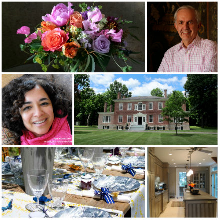 Speakers and presentations, clockwise from top left: Centerpiece by Isabelle Bosquet-Morra of Fleurisa; Thomas Burak of Thomas Burak Interiors; home on historic house tour; kitchen in house tour; tabletop by Michael Devine Home; Amy Crane of Amy Crane Color.