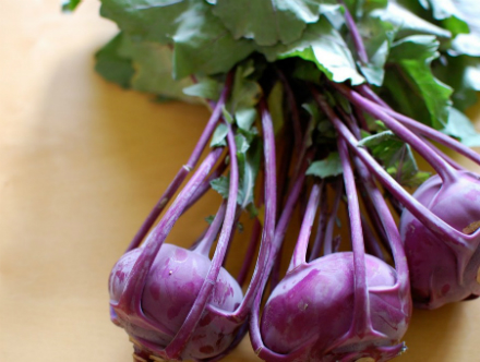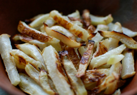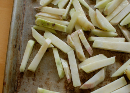 Kohlrabi Fries 1 bunch (about 4 bulbs) kohlrabi, purple or green Olive oil Salt Preheat the oven to 425 degrees. Separate the kohlrabi bulbs from the greens. (Save the greens for cooking later.) Peel the bulbs thoroughly, until you have a white orb of kohlrabi. Slice into rough batons, or fry-like slices. Toss with a glug or two of olive oil and a pinch of salt. Spread onto an oiled baking sheet and bake, occasionally shuffling with a spatula, for about 40 minutes, or until brown, tender on the inside, and a bit crispy on the edges. Serve hot, with a bit more salt to taste. Reprinted with permission from Eatingfromthegroundup.com. All text and photos copyright 2008-13 by Alana Chernila.