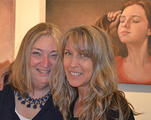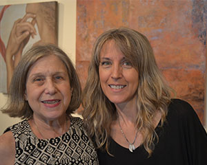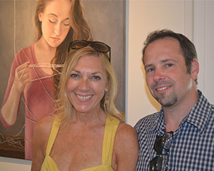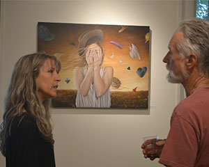 Regina Burgio reports from Spencertown. Against the backdrop of a perfect summer evening, Kris Galli opened her solo show of new works, Dreams & Digressions, on Saturday, June 28 at the Spencertown Academy. A self-taught artist, Galli has been painting for more than 25 years and has built a following of ardent admirers throughout the region, many of whom came out to see the exhibit of recent figurative and abstract work. The show's signature piece, "Everyone You Have Ever Known," was highlighted on the cover of the July issue of Berkshire Homestyle Magazine, and features a young woman covering her eyes, hair blowing across her face, while various hats float behind her. The artist lives with her husband, photographer Edward Acker, in Lenox. Her work is shown regularly at various locations throughout the Northeast as well as restaurants in Lenox, including Alta Restaurant & Wine Bar and Church Street Cafe. Dreams & Digressions will be on display until August 10. Above, Galli discusses her signature painting with one of the guests.