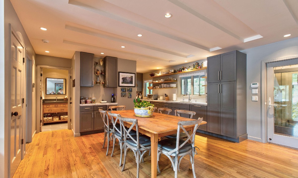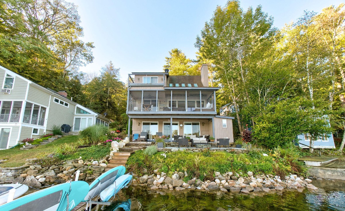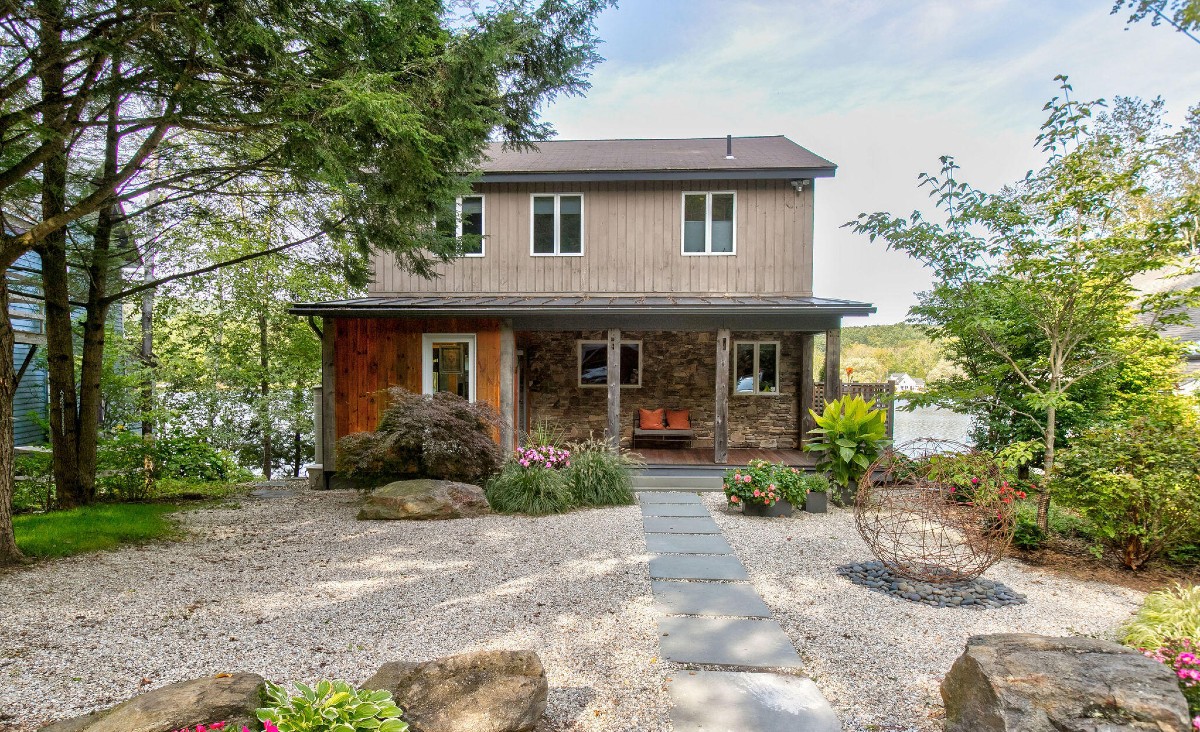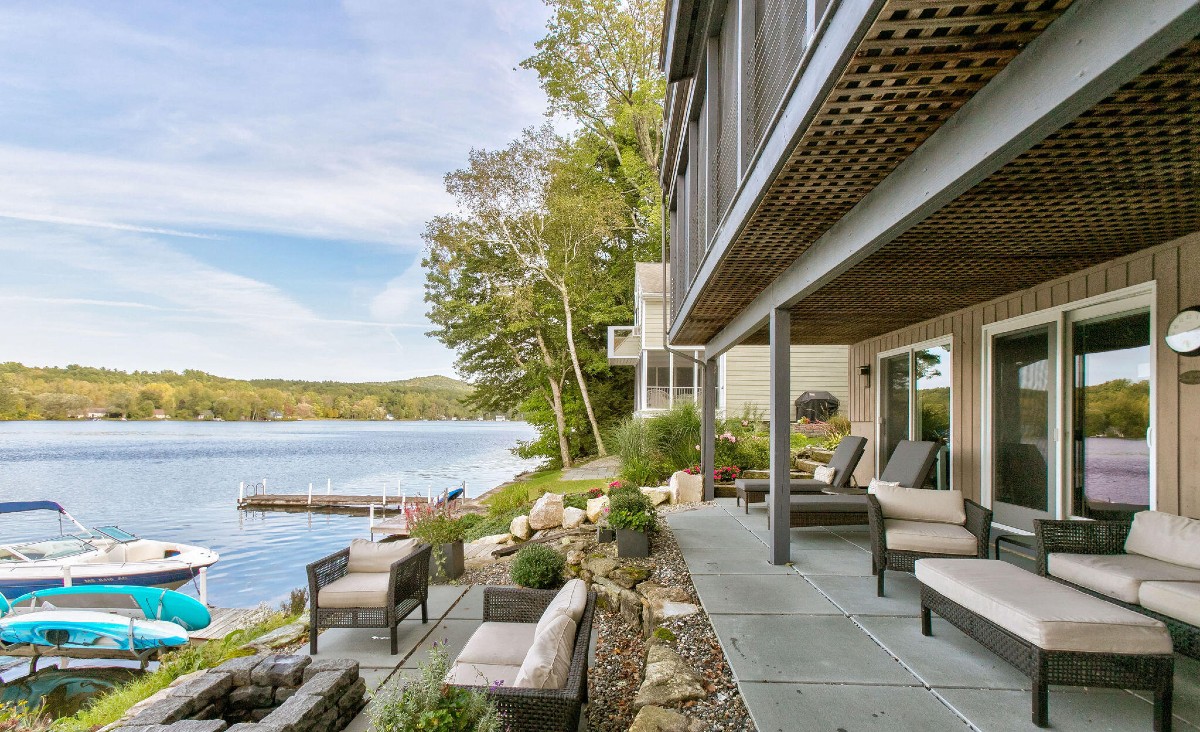 This three-level Contemporary in New Marlborough has been remodeled and now includes outdoor gathering spaces. There are three bedrooms and three bathrooms, an open living area, and an updated kitchen. Outdoors there is a grilling porch, landscaping with an irrigation system and stone-fence siding. The house has AC, generator, and ceiling heaters on the porch. Listed at $1,750,000 by Lance Vermeulen Real Estate.