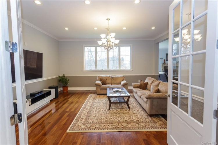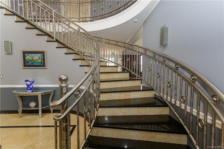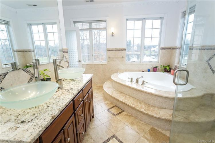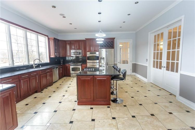 Custom built in 2007, this Colonial in Lagrangeville has five bedrooms and five bathrooms. The high-ceilinged foyer features a magnificent staircase, marble flooring and a grand chandelier. The chef's kitchen offers both and electric cooking setups. The family room, kitchen and first-floor deck overlook a lake, while the second-floor balcony overlooks the mountains. Listed at $989,000 by Weichert.