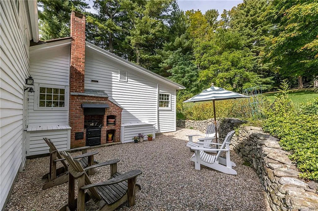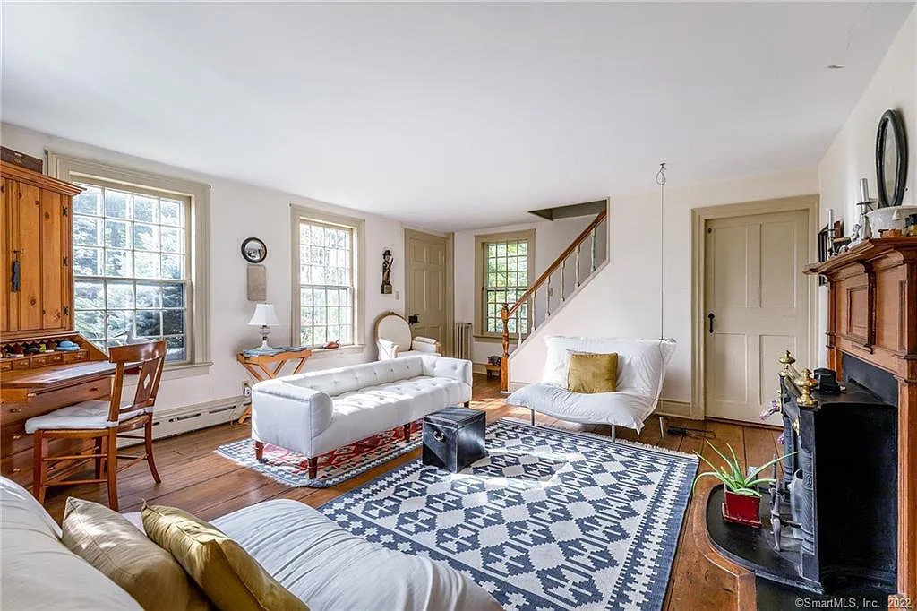 According to historical records, this1820s eyebrow Colonial in Lakeville was owned by Samuel Robbins, an ironmaster from Lime Rock. It has three bedrooms and three bathrooms, a sunny kitchen, living room with Franklin stove, and "secret" closets. Outside is a patio with outdoor fireplace, flower gardens, and a one-car attached garage with another bedroom and bath above. Listed at $895,000 by William Pitt Julia B Fee Sotheby's International Realty.