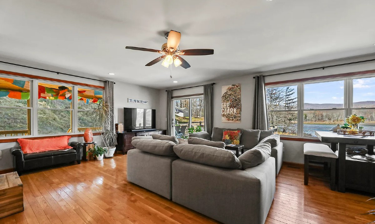 Built in 2012 beside Pontoosuc Lake Cove in Lanesborough, the three-bedroom, three-bathroom home features an inverted floorplan for lakefront living, with main living spaces upstairs to take in the westerly views while cooking and dining. Downstairs offers two living rooms to exit lake level with walkout features to the deck, lawns, gardens, and firepit. Listed at $888,800 by William Pitt Julia B Fee Sotheby's International Realty.