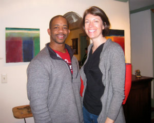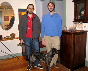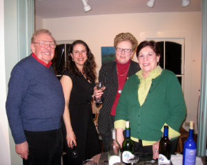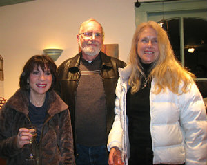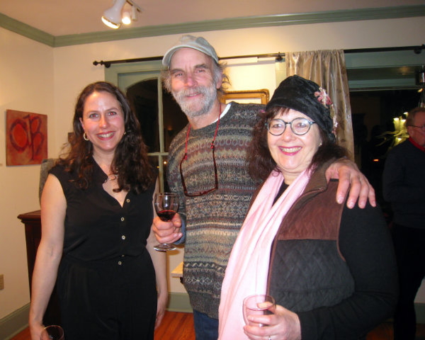 Lisa Green reports from Great Barrington. It will please many to learn that the jewelbox building on Main Street that formerly housed McTeigue and McClelland’s showroom has been inhabited by another artistic venture. Bronze and glass sculpturist Natalie Tyler has opened L’Atelier Berkshires, a contemporary art gallery and working sculpture studio in the iconic yellow house. On Saturday, Feb. 20, Tyler held an opening for Diapause, a mid-winter interactive art event, which features her installation of human-sized cocoons that create an environment of introspection through illumination. The cocoons brighten and dim in response to the movement of the viewers. Also exhibiting were works by artists John Ratajkowski, Sarah Logan and Eva Connell. Diapause will be on view through March. Above, Wayne Eline and Mary Jane Eline, owners of Les Trois Emme Winery in New Marlborough, Mass., flank galleriest Natalie Tyler and Barnbrook Realty owner Mary White.