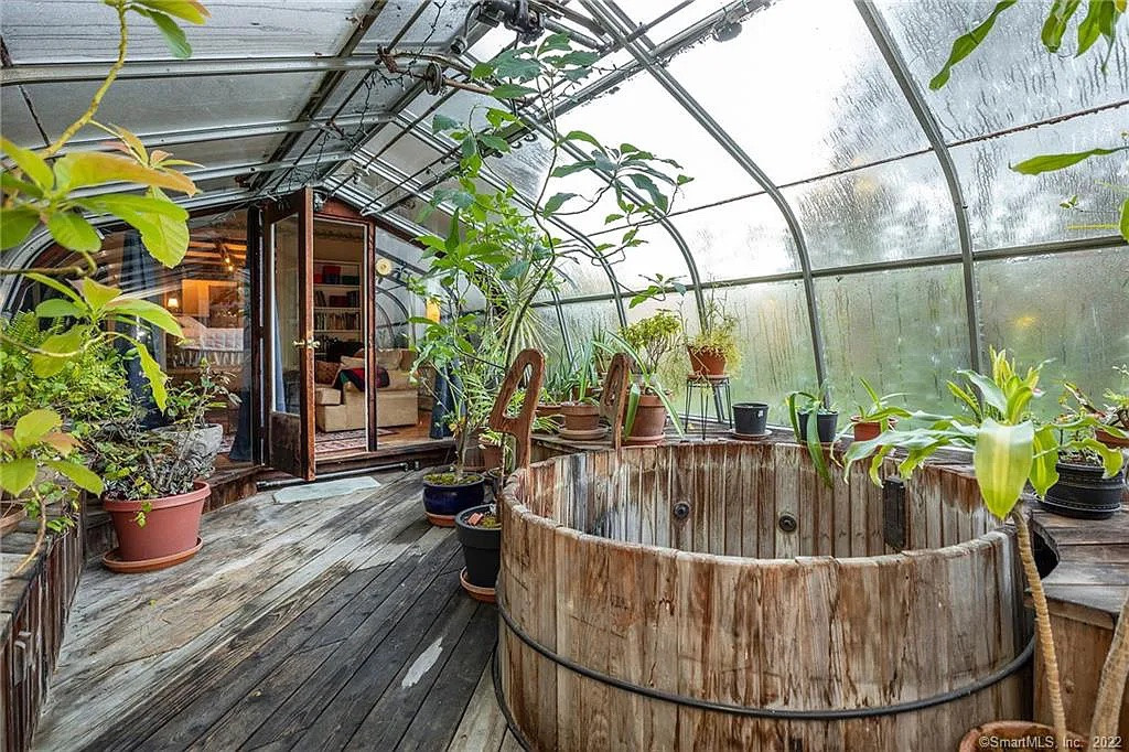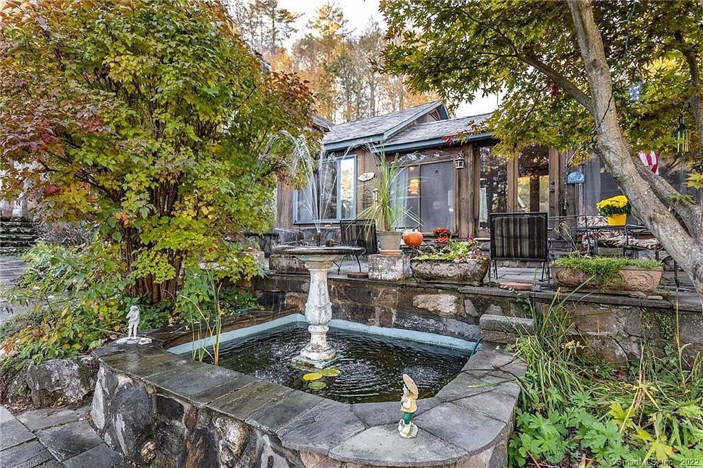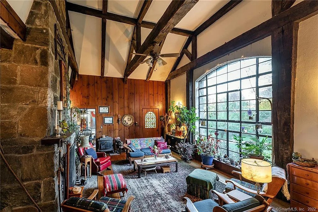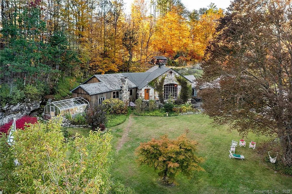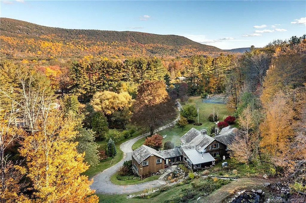 Laughing Willow Farm in Canaan, Connecticut was designed and built to be one with the land. The five-bedroom, seven-bathroom home has a massive stone facade and windows surrounded by stone patios. The 24.71-acre property includes a finished attic, a tennis court, a three-car garage, and views of Canaan Mountain. Listed at $795,000 by William Pitt Julia B Fee Sotheby's International Realty.