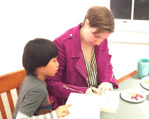 Jamie, son of Tom Levine, serves as the author's helper at the book signing; Bianca Griggs, who owns The Wish House, stocks books for the crowd.