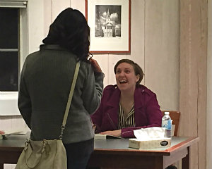 Jacque Schiller reports from Cornwall. On Sunday, Nov. 27, an all-ages crowd gathered at the Cornwall UCC for a sold-out Cornwall Library benefit reading of Not That Kind of Girl by Lena Dunham, followed by an unscripted Q&A between the writer and her mother, artist Laurie Simmons. The dynamic between mother and daughter was interesting to hear and watch. After sharing how “horrific" she found reading negative comments, Ms. Simmons asked how her offspring felt becoming an overnight “posterchild for anti-Hollywood and fashion?" Lena assured us that she “even ate some food that day, guys" then self confidently expanded on the issue of body image. “It’s not exactly the job I thought I was setting out to do, but if you’re given that mantle and think can you can be helpful, you must take it and run with it. I’m lucky that I’m no longer alone in that. I’m good friends with Mindy Kaling and Amy Schumer — there’s a whole army of us who are coming in and saying this is also what a female body looks like. Admittedly, they’ve not been as naked as I have on television." This refreshing, inspiring banter continued all the way until the last question of the night, from an audience member. “How do you like Cornwall?" Ms. Simmons answered for Lena, “You love Cornwall," to which her daughter playfully agreed. “Did you not think I was going to say that? Cornwall is beautiful and has history and haunted things and not haunted things and the Moose and post office. I come here to think and relax and recover emotionally. I wrote some of the book here." For two hours after the reading, the creator of the critically acclaimed HBO series Girls, and co-founder of e-newsletter, Lenny, graciously signed copies of her book, occasionally standing up to hug an appreciative reader.
