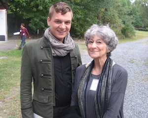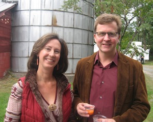 Rachel Louchen reports from Ghent. Sight, sound, smell, touch and taste were all accounted for at Omi International Arts Center on Saturday, September 20 for the first Light Into Night, a unique fundraiser that combined an auction, dinner, art exhibit and dance party. Art abounded in every nook and cranny of the grounds as musicians wandered about with various instruments, interpretive dancers performed, guests made funny faces at the photo booth, and the two-story barn displayed visual and video artwork. While “no touching" is usually the first rule at art exhibits, an intriguing aspect of the event was the interaction encouraged of the guests; such as painting a candle and setting it adrift at the pond and participating in a dance performance; quite appropriate for the organization which hosts residency programs for artists, writers, musicians and dancers. These exciting events were all a lead-up to a fantastic family-style farm-to-table dinner by Black Forest Flammkucken and a full-on dance party in the barn, before closing the memorable evening with an auction. Dancer Vincent E. Thomas smiles with executive director Ruth Adams after his dance and movement performance which required the viewers to shout out questions and strike poses.