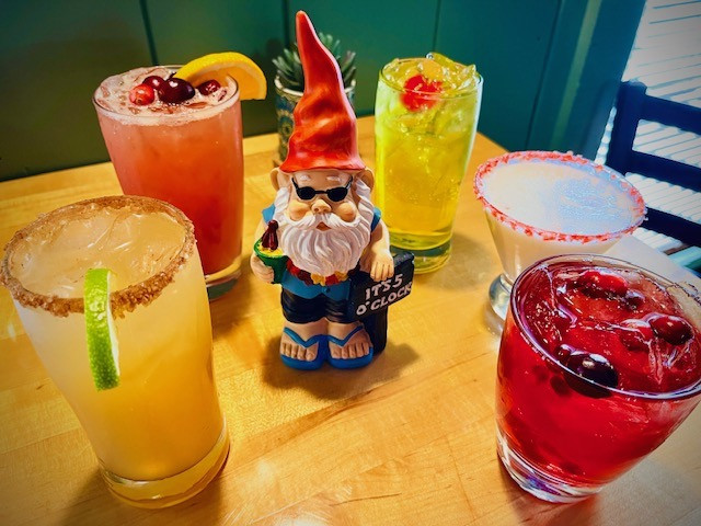 Seasonal cocktails with gnome monikers, including the Gno-melon-tail and Gnomarita