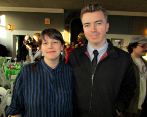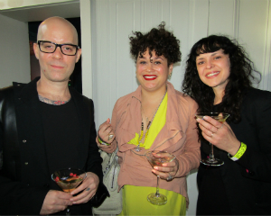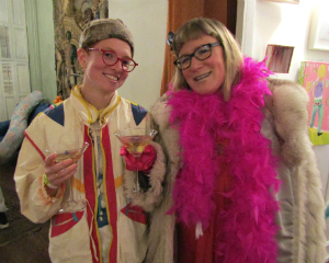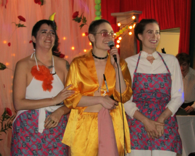 Amy Krzanik reports from Hudson. Raucous laughter, heartfelt embraces and happy tears were seen and heard throughout the Hudson Elks Lodge during Lil’ Deb’s Oasis Fundraising Gala on Saturday, March 31… and that was before the main event — the owners’ professional commitment ceremony — had even begun. Carla Perez-Gallardo and Hannah Black, the owners of Lil’ Deb’s Oasis — a friendly, funky “tropical comfort food” restaurant on Hudson’s Columbia Street — threw the party to celebrate their creative partnership and to invest in its future. Top donors were treated to a cocktail hour with drinks by Arley Marks, and dinner by Lil’ Deb’s and New York City chefs Angela Dimayuga, Gerardo Gonzalez and DeVonn Francis. The ceremony, and a dance party with performances, followed. A silent auction featuring artwork, fashion, experiences and more included more than 70 contributors from near and far. The restaurant, launched two years ago, is sporting a redesigned website and has opened a private dining room adjacent to its main seating area. We can’t wait to see what else they’ve got planned for the future. [Above: Carla Perez-Gallardo and Hannah Black (with co-worker Wheeler, who gave the wedding sermon) address the crowd pre-ceremony. Both brides were brought to tears discussing how their chance meeting and partnership have changed their lives.]