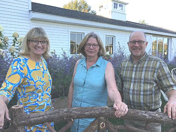 LHS President Jane Hinkel, Executive Director Catherine Fields and Vice President John LaGattuta in front a rustic gate locally crafted by Christopher Hawver. (The historical society is also raising money for the purchase of two gates by Hawver for the landscaping project.)