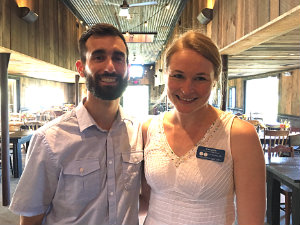 Elyse Sadtler reports from Morris. The Litchfield Historical Society held its annual fall fundraiser on Sunday, Sept. 17 at South Farms in Morris, Conn. This year’s event took the form of a pig roast, featuring barbeque from When Pigs Fly South of Sharon, Conn. as the main fare. As guests began to arrive, they were greeted by music from the band Switch Factory, which provided live music for the evening. Jack Baker from the Litchfield Distillery served up cocktails and mixed drinks featuring their bourbon and vodka, including their new cinnamon bourbon. Proceeds from the event go toward funding the historical society’s educational initiatives, which include offering programs to students at Litchfield Schools — at no cost to the school system. On display at a side table were the plans for the Tapping Reeve House and Litchfield Law School grand landscaping project. [Above, Dave Hunt and Curator of Education Kate Zullo.]