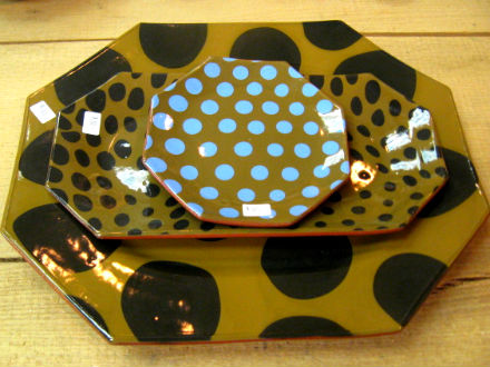 For the past twenty years in her barn-studio in Ghent, Lauren Mundy has been using modern colors and an old slip-paint technique to create her distinctive pattern-on-pattern redware. The group shown here, $35 - $160