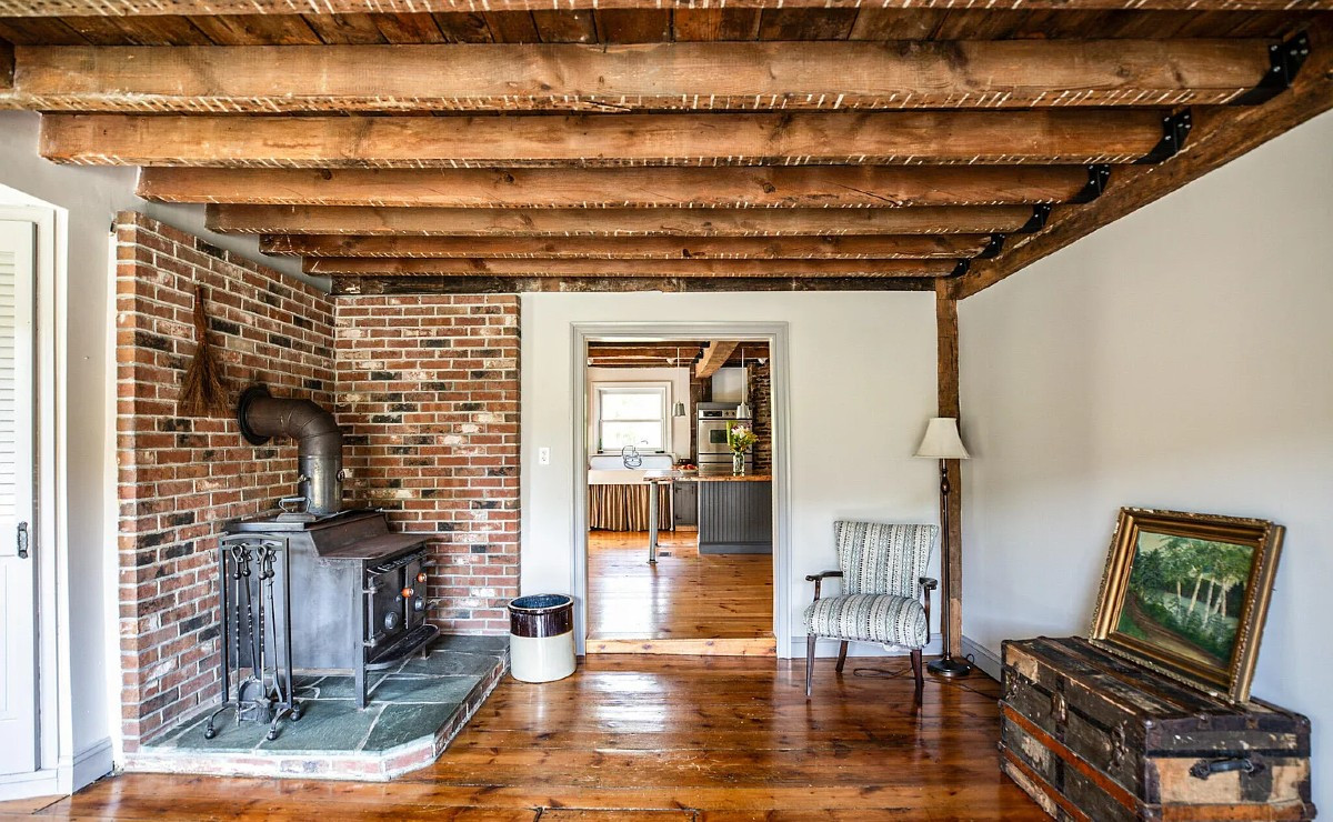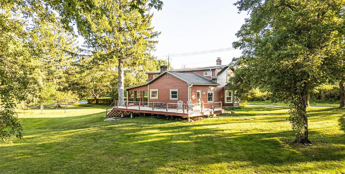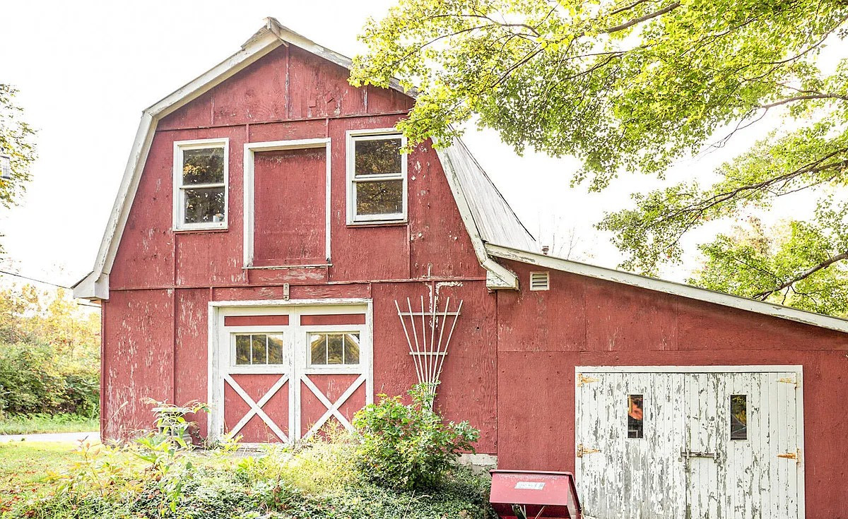 Lockwood Homestead in Craryville offers four bedrooms, two bathrooms, a spacious eat-in kitchen and living room with a wood-burning stove. Its 1850 beginnings are evident in the exposed beams and wide-plank floors. Outdoors, there is a large wraparound deck, covered porch, a private pond, barn, and garden. Listed at $395,000 by Houlihan Lawrence.