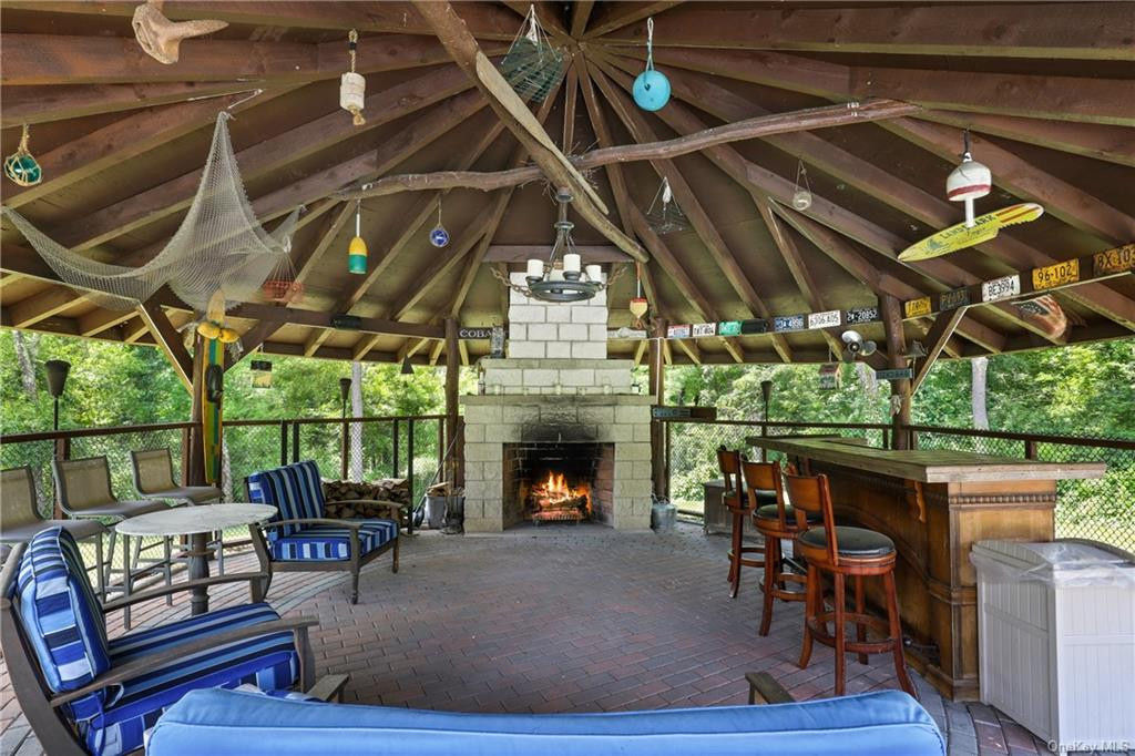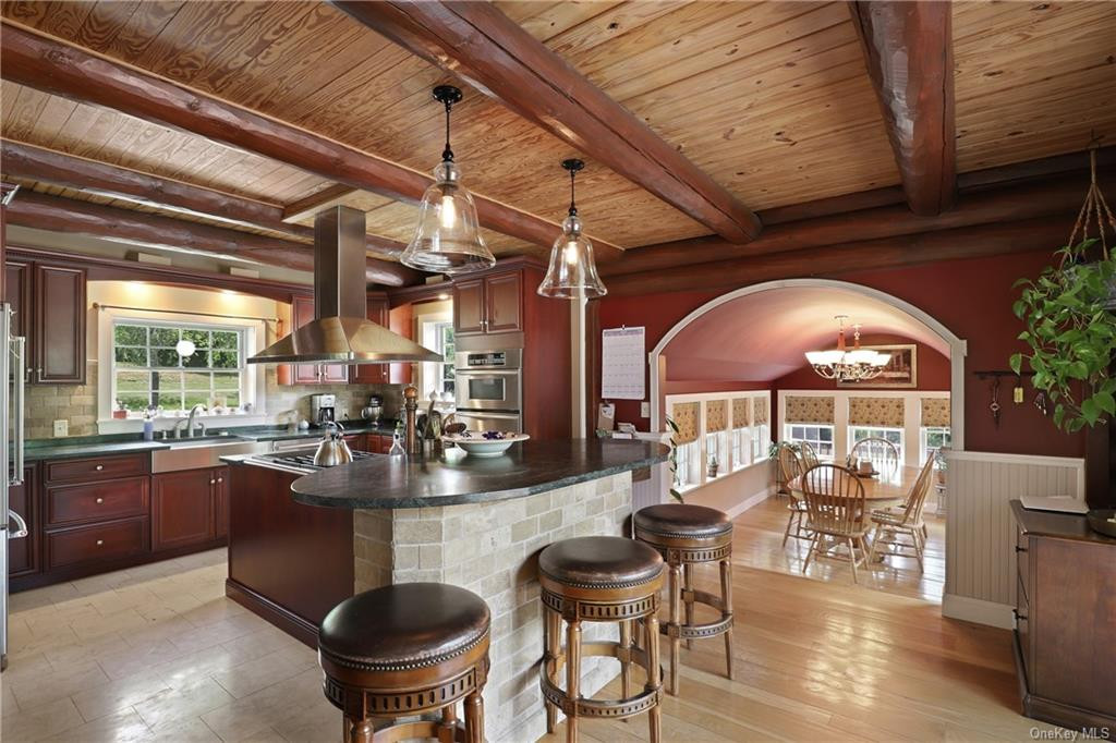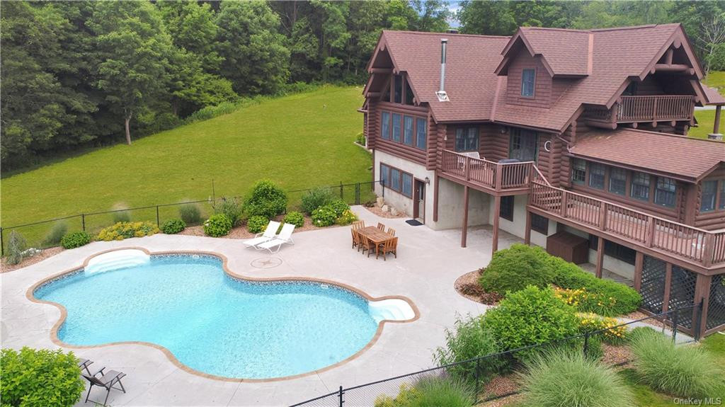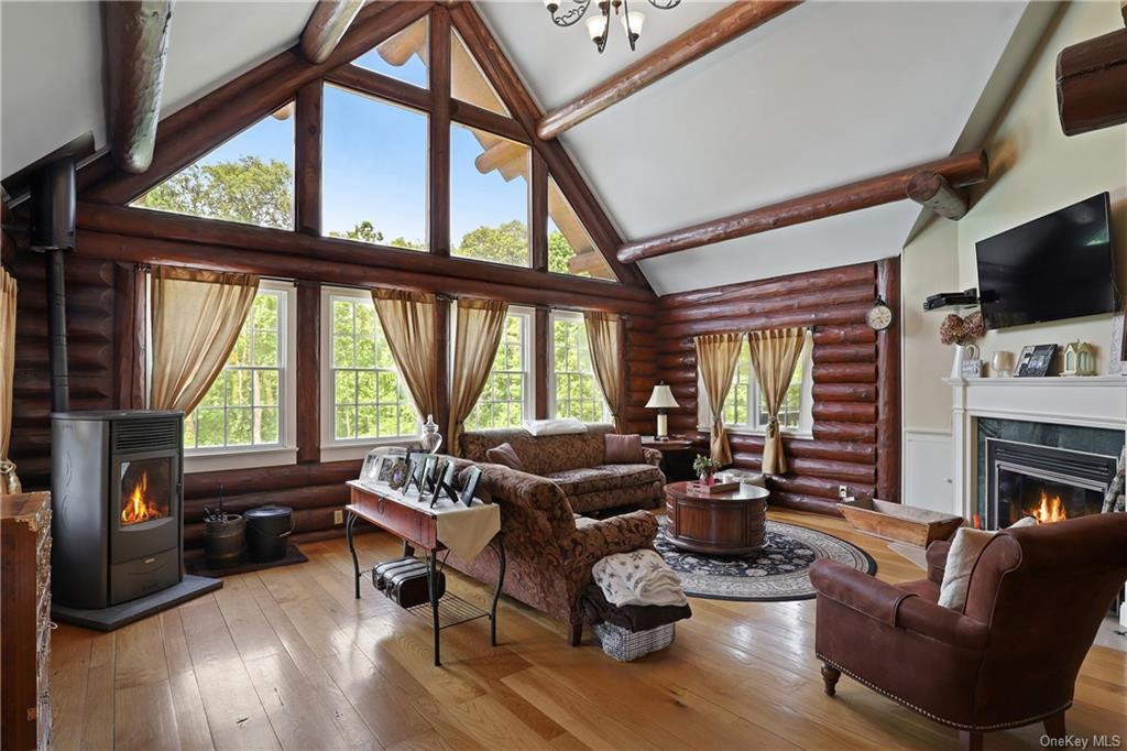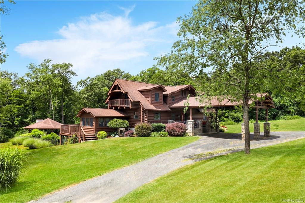 This contemporary log home in Millbrook has four bedrooms and four bathrooms. The outside features extensive decking, private balconies throughout the house, a saltwater pool, and a basketball court. The lower level can be a seaprate in-law suite and includes a family room and guest room. The gazebo is equipped with a fireplace and wet bar, and the three-car garage offers ample studio space above. Listed at $995,000 by Compass.