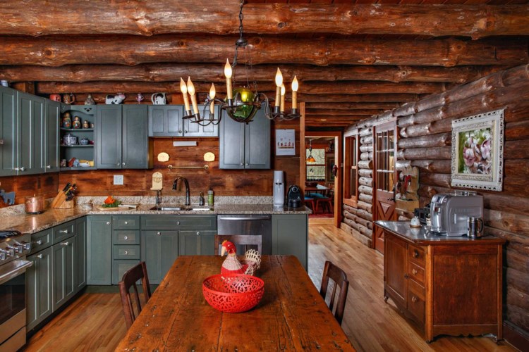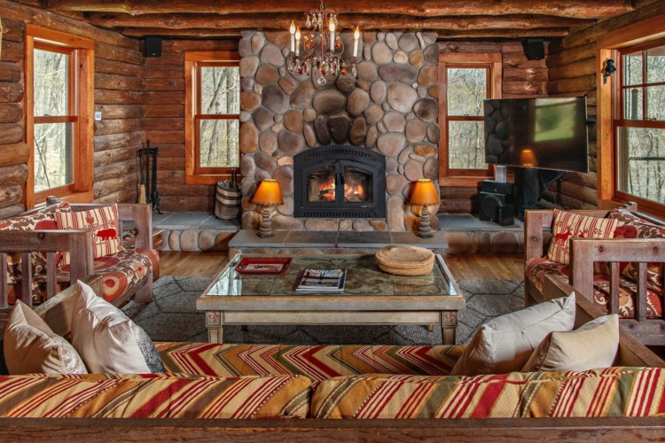 The Adirondack-style chalet in Rhinebeck has two bedrooms and three bathrooms and over 2,200 square feet. It was renovated in 2016 into a contemporary log cabin with a modern feel. It offers several fireplaces, an open floor plan, and a large front porch overlooking the pool and a pond. The home has central air and a whole-house generator. Listed at $1,450,000 by Berkshire Hathaway Home Services.