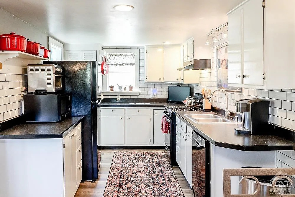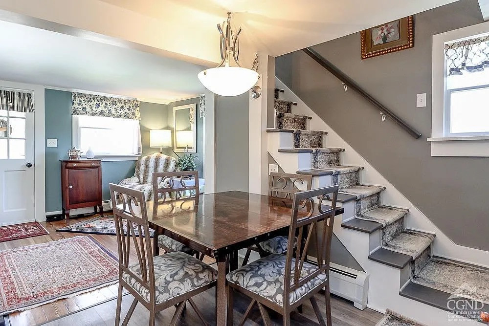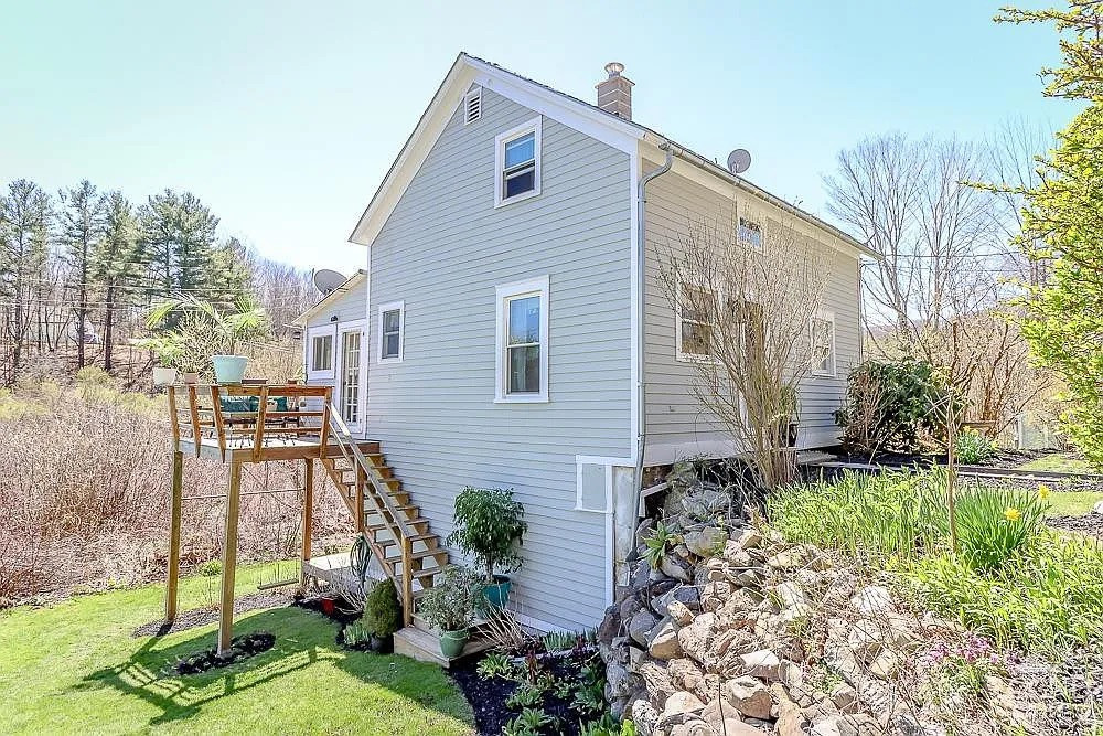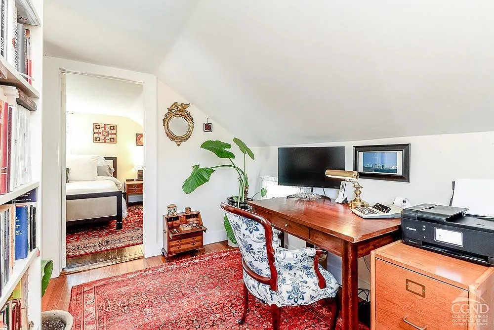 This is an adorable, low-maintenance cottage near Queechy Lake: 28 Upper Queechy Road in Canaan. Built in 1900, it comes with lake rights and a compact 1,100 square feet of living space, with sloping ceilings upstairs that evoke a proper camp house vibe.