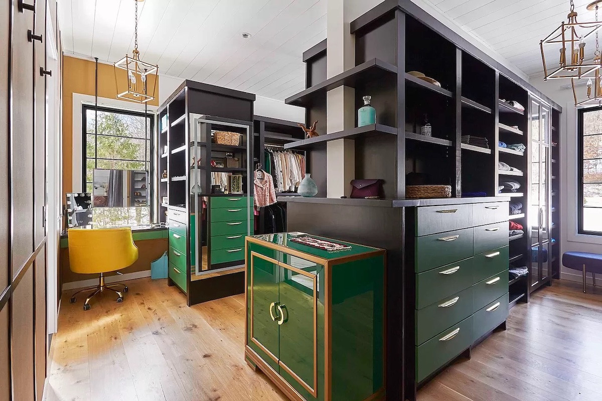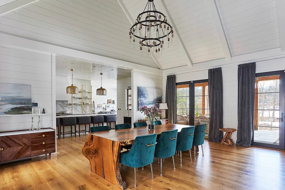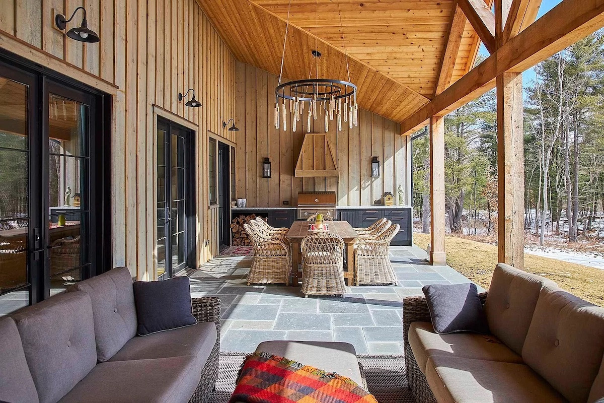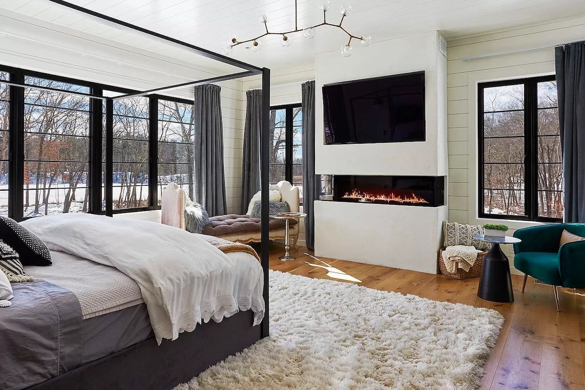 Built in 2020, a modern farmhouse in Rhinebeck is being sold fully furnished. It combines top-of-the-line finishes, modern technology and a country vibe. There are five bedrooms and five bathrooms, a great room, dream kitchen (with separate coffee and cocktail bars), and butler's pantry. The primary suite includes a reading nook, fireplace, views, and full dressing area. There are two second-level wings, a basement with 12-foot ceilings, geothermal heating and cooling, and Tesla chargers. Listed at $4,250,000 by Sotheby's International Realty.
