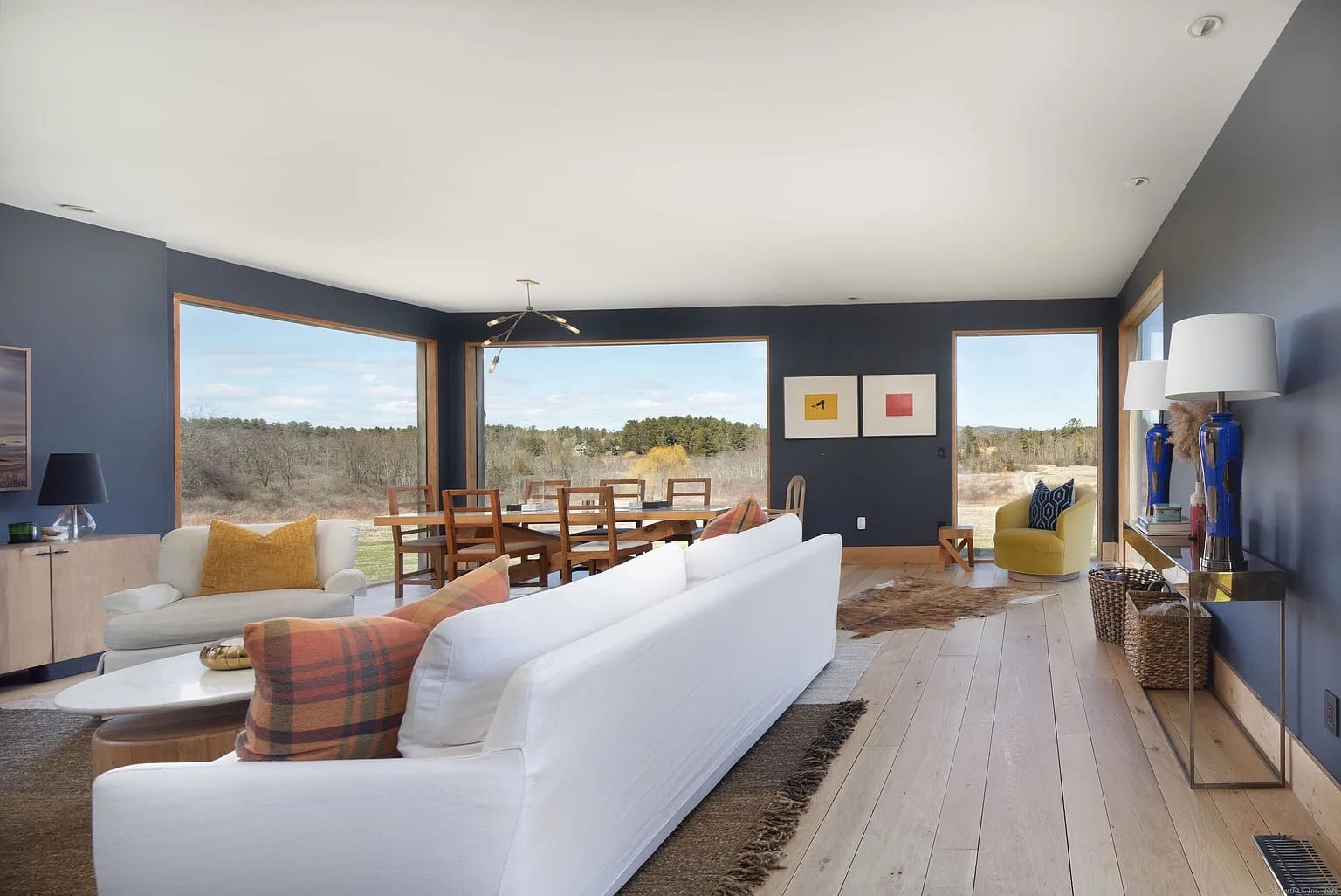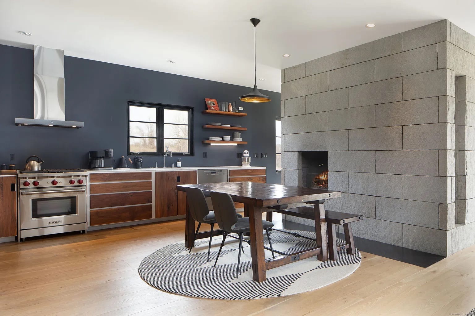 The renovation added huge glass windows that frame the Litchfield hills and turned the main 160-foot barn into an entertaining space. There are four bedrooms and three bathrooms, and at the center of the home is a granite fireplace that connects the living room and kitchen. There’s one main-floor bedroom and three other upstairs bedrooms with high ceilings, with a spa bathroom attached to the primary suite.