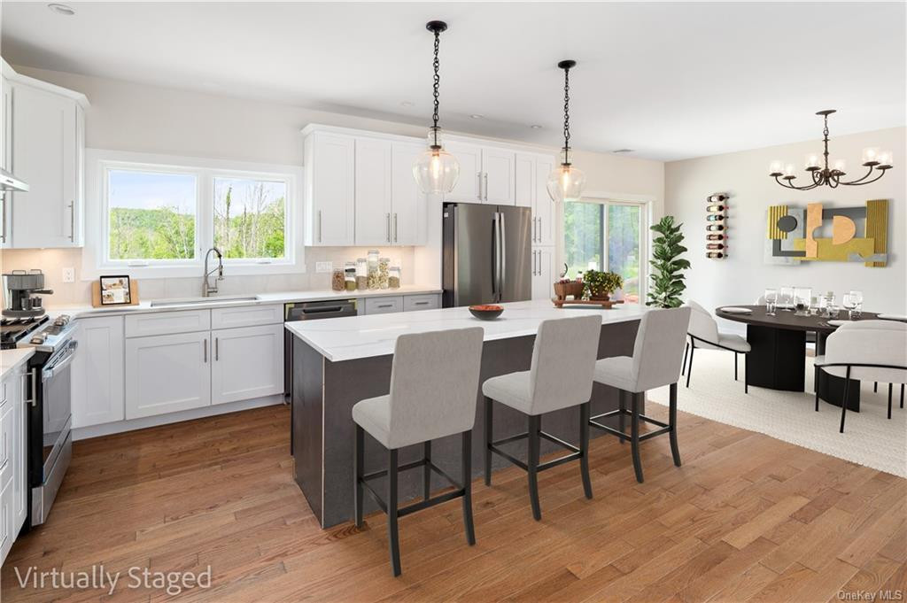 This 3,400-square-foot home in Lagrangeville was built just this year, and has three bedrooms and three bathrooms. The contemporary ranch offers modern finishes with some rustic wood features. Amenities expected with a new home include a high-efficiency boiler, ample storage, recessed lighting, a two-car garage, generator hook up, and, of course, a gourmet kitchen. Listed at $699,000 by Giner Realty.
