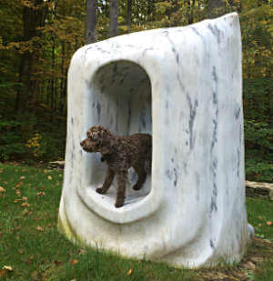 And indeed he did. That was in 1984 and for several years he followed the same cycle; a third of the year working in Italy, a third working at a family home in the Adirondacks, and the last third in New York, peddling the work he had created. In the beginning, however, his work was not as massive as it has become. Mennin bought his Bethlehem home about 20 years ago with the idea of enlarging the scope and size of his work. The scale of his sculpture has evolved to giant landscape and architectural pieces which, in many cases, involve hundreds of tons of granite. “Most of my pieces are displayed outdoors,” Mennin explains. “So I use granite because it’s permeable. Marble doesn’t weather as well in the northeast; I carve marble and onyx for spaces that don’t have a winter.” Mennin stockpiles stone on his property and tends to have about 1000 tons on hand. Fortunately he has a 3000-square-foot barn and 10,000 square feet of outdoor space. He also has a 3500-square-foot space in town; he refers to it as the “Winter Palace” which he uses when it’s too cold to work outside.