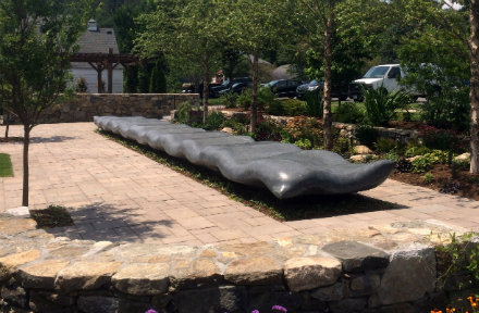 He does all the carving himself and has produced a large body of work for both private and pubic collections, including the fountain and installations at New York’s Chelsea Market; Stanford University; Penn State University; Bruce Park, Greenwich, Connecticut; Laumeier Sculpture Park, St. Louis, Missouri; The deCordova Sculpture Park and Museum, Lincoln, Mass.; Delbarton School, Morristown, New Jersey; SUNY Staten Island; and the Hotchkiss School, Lakeville, Conn. Most recently Mennin created the unique bench that sits in the Judy Black Memorial Park and Gardens in Washington Depot. “Originally we were going to put in a fountain,” explains Mennin. “But dealing with northeast weather presented a problem and a fountain is not so impressive when it’s turned off. I made a model of the bench I had in mind and everyone seemed to love it.” What’s not to love? The bench is made of black granite, measures forty feet long by five-and-a-half feet wide, and weighs 60,000 pounds. The subtlety of the waves across the bench adds to the mystery and allure of the piece. It is a sight to behold and a testament to Mennin’s creativity and ingenuity.