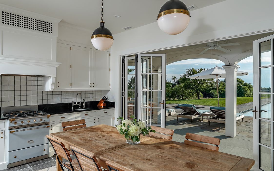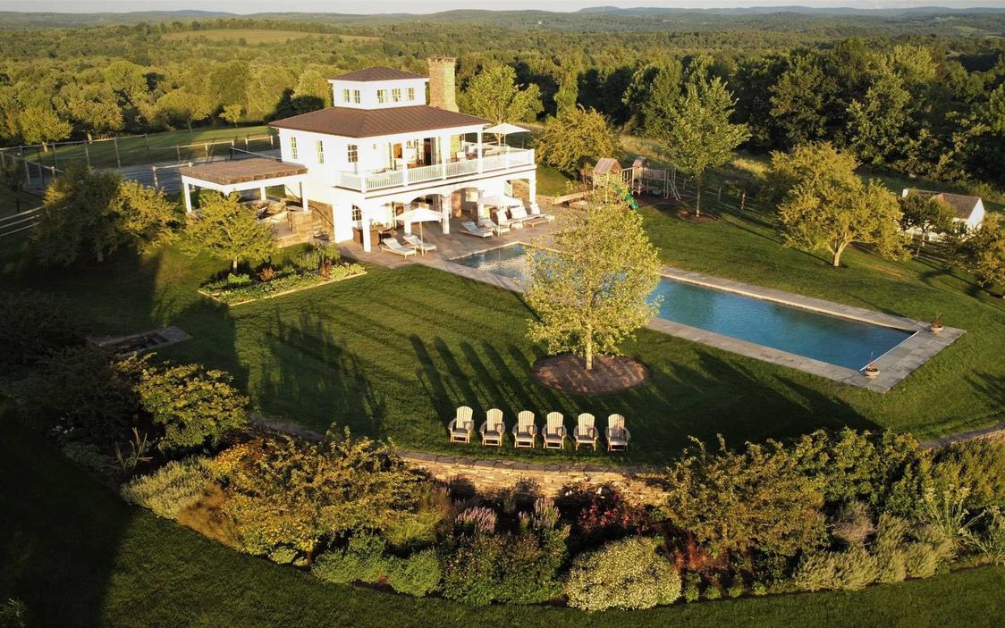 Privately situated up a winding drive through an apple orchard, this Chatham estate on 100 acres includes not only the manor house, but a pool house, two studios, two oversized garages with studio space and more. The main home has five bedrooms and five bathrooms, a professional country kitchen and butler's pantry, large screen porch and patio. The three-story pool house provides living space overlooking the pool and tennis court. Listed at $7,500,000 by Houlihan Lawrence.