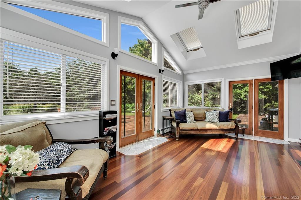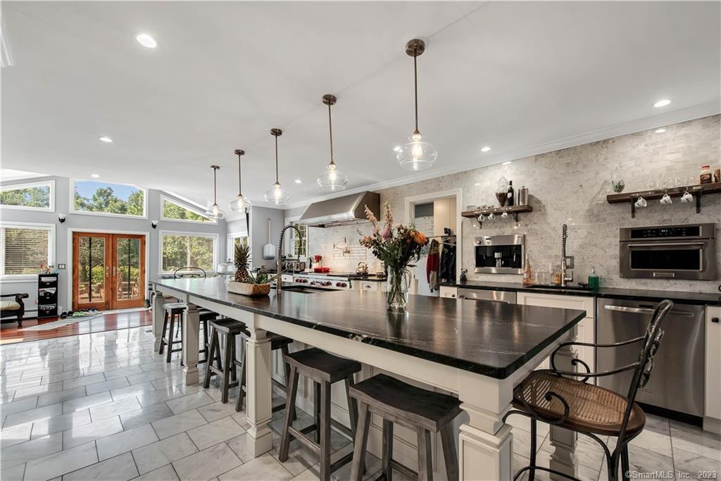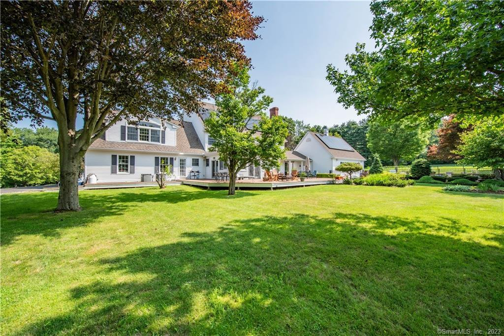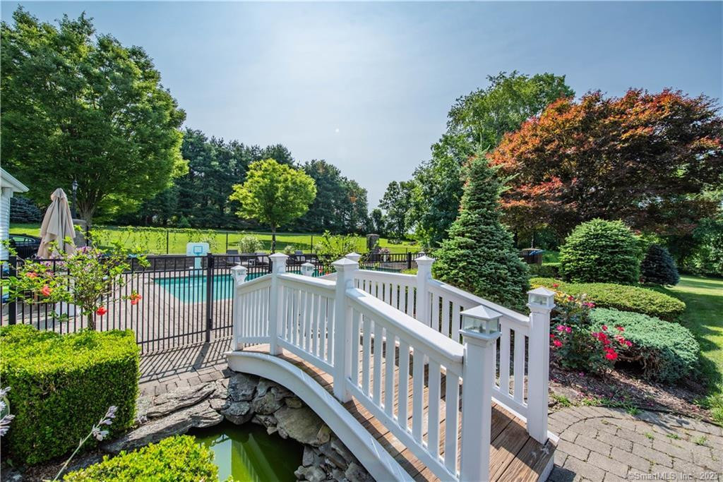 Located in Bethlehem on a cul de sac, this Colonial, built in 1992, offers four bedrooms and four bathrooms and a huge chef's kitchen. An expansive circular drvieway leads to an inviting entry with marble pillars. The seven-acre property features gardens, along with cork, dogwood, blueberry, redwood, and countless rose bushes. Two large wildflower beds welcome bees, butterflies, and hummingbirds. A solar-lit bridge has two koi ponds and leads to a gunite pool. There are four garages, and the house is outfitted with five heat zones and two colling zones. Listed at $999.900 by Drakeley Real Estate.