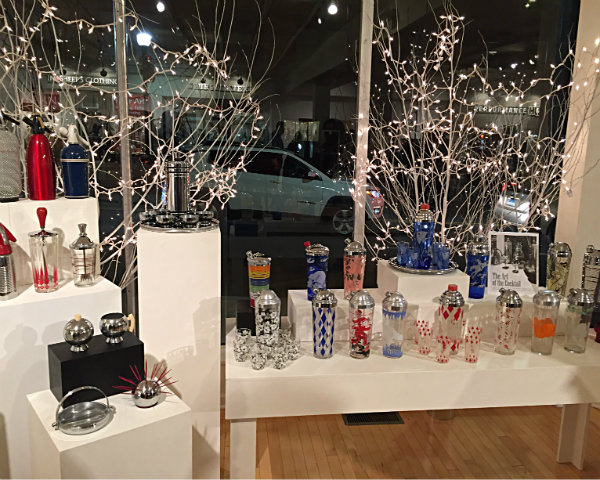 Just part of the collection from Tim Bouthillier's "The Art of the Cocktail" display of martini shakers.