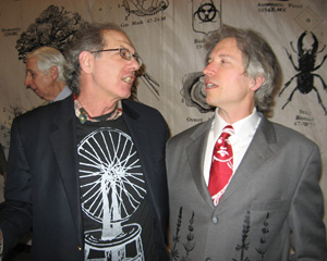 Amy Krzanik reports from North Adams.On Saturday, April 6, MASS MoCA marked the conclusion of its Oh, Canada show and the opening of three new exhibits with the 3-2-1! Celebration, a night jam-packed with events. The evening commenced with a cocktail party in the galleries and a silent auction in the lobby, where attendees could bid on art by Sanford Biggers, Mark Dion, and Moyra Davey, among others. The artists who created the night’s three debut exhibits — Life’s Work: Tom Phillips and Johnny Carrera, Mark Dion: The Octagon Room, and The One Minute Film Festival — were on site to discuss their work. Artist Johnny Carrera (near left) and Center for Book Arts founder Richard Minsky are shown in front of one of Carrera's works. A benefit dinner followed under Xu Bing’s fabulous, large-scale Phoenix project in Building 5, and the night culminated in a dance party with Canadian DJ King Khan, a self-described “spiritual guru," spinning a blend of vintage soul, R&B, garage rock, and funk. All proceeds from the evening support new work made at MASS MoCA.