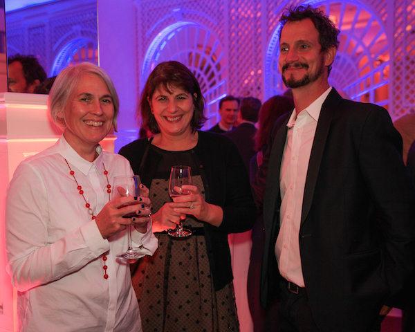 Andrea Yost and her husband, artist Francesco Simeti, who made the centerpieces for the night's event, flank Lisa Panzera, Director of Fergus McCaffrey Gallery.