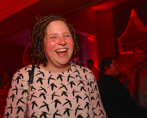 Matteline deVries-Dilling, founder of Lite Brite Neon, one of the evening's honoree of this year's Upstate Benefit adresses the gala from the Caboose's caboose.