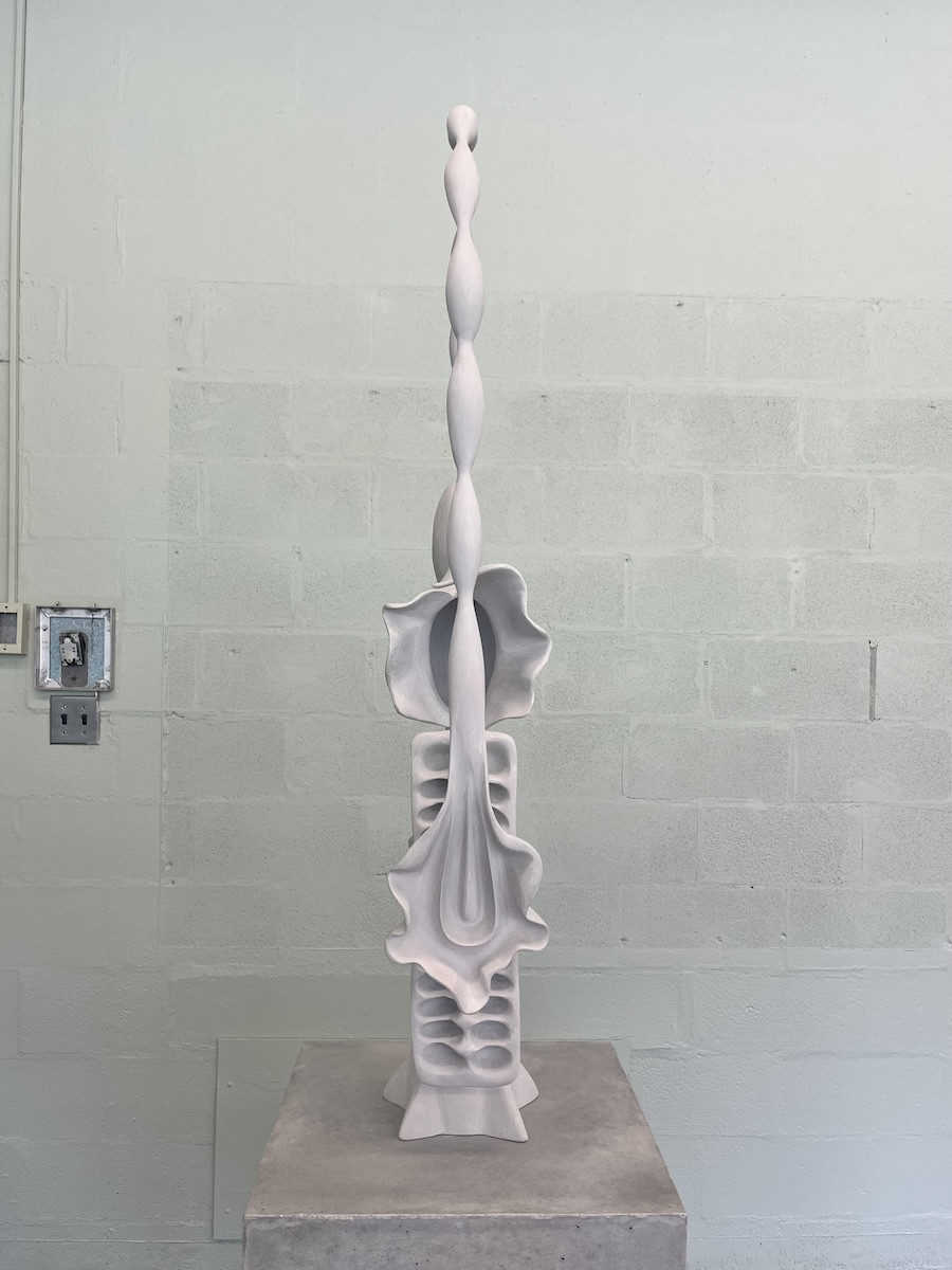 Among some of the notable artists in the show, like Kiki Smith, Richard Tuttle, and Daniel Buren, is Ming Fay, probably best known for his large-scale public art, who passed away in March at age 82. Here, natural forms subsume a former schoolroom, bringing together multiple decades of Fay’s work in a concentrated retrospective. There’s the artist’s early pieces, supersized fruits, seeds, and plants made of papier-mâché over steel wire armatures, and his later abstract pieces that echo the organic natural world in various materials like ceramics, bronze, and polyurethane. “You can see the evolution of his artistic practice,” Parker Fay, the artist’s son who is also the director of the Ming Fay studio, says. “They represent three or four decades of his work. It’s a nice tight grouping of work but there’s a very wide variety. And I’m glad we’re able to show both small and big sculptures.”