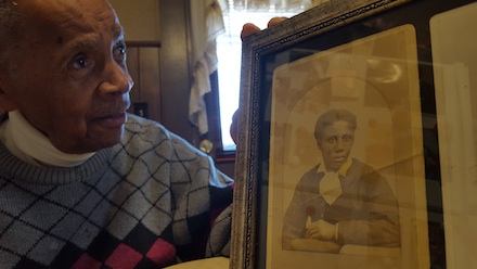 Lieutenant Walter Patrice with a picture of one of his ancestors in Poughkeepsie.