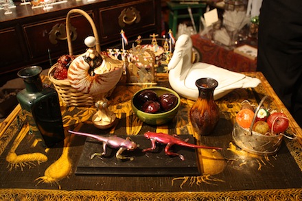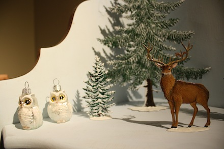 McGhee and partner Ronald Kopniki said the appeal of Christmas ornaments is a kind of healthy nostalgia. Because you see them for only a little while each year, the feeling and the memories they impart intensifies. “It’s a thing that binds the generations,” says Kopniki. “The memories attached to the decorations go beyond the actual objects.” The shop itself makes for an elegant and festive visit. In one of Warren Street’s beautiful old buildings the space is resplendent with ornate historic moldings and built-in cabinets that set the perfect stage for art glass or the intricately painted little dioramas and Nativities. The miniature pewter “flats” that make up the little winter and woodland scenes are a really pleasant surprise. They are sweet looking from far away and a wonder from up close, hand painted in intricate, nearly microscopic detail.