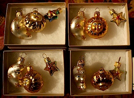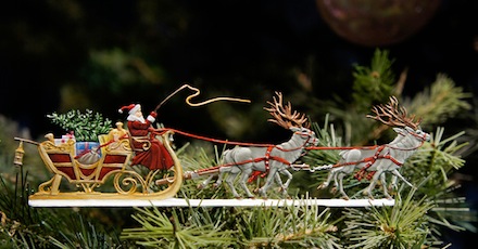 "Flats are a key component of my business,” McGhee says. “These hand-cast, hand-painted forms and figures are related not only to Christmas, but to other themes and seasons. There are trees, bare or in leaf, elaborate 18th-century garden scenes, winter skating scenes and circus scenes, for example, as well as Christmas trees, Santa in his sleigh or carrying a sack of gifts, and Nativity scenes.” McGhee’s ornaments seem somehow pre-charged with pleasant holiday memories. There’s a collective sense of the holiday warmth molded and painted into them, by his own hand or his elves over in Germany.