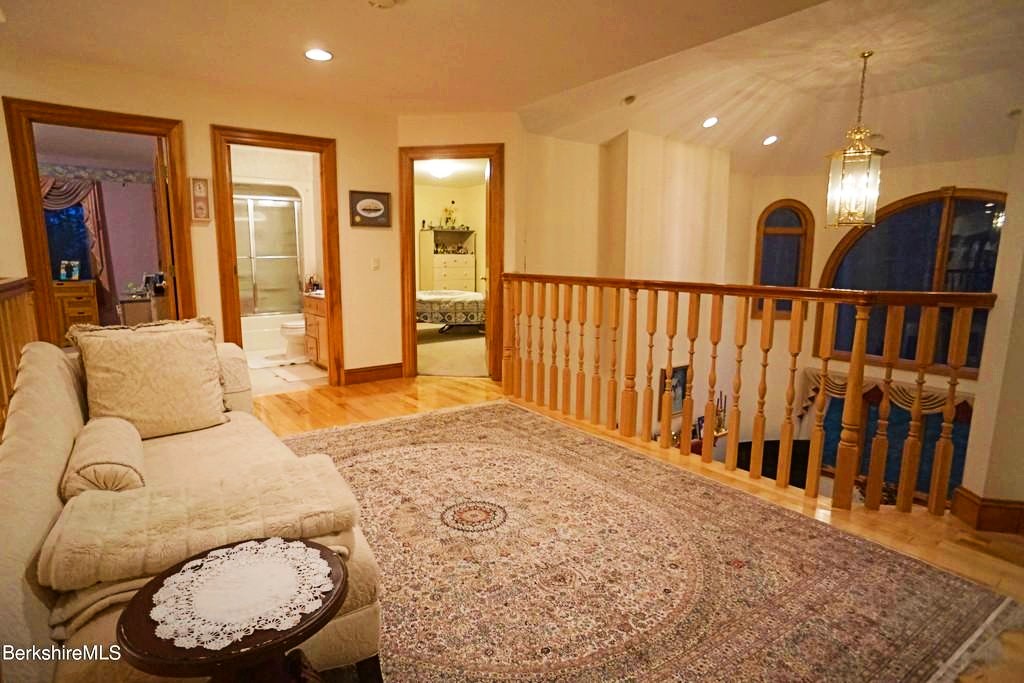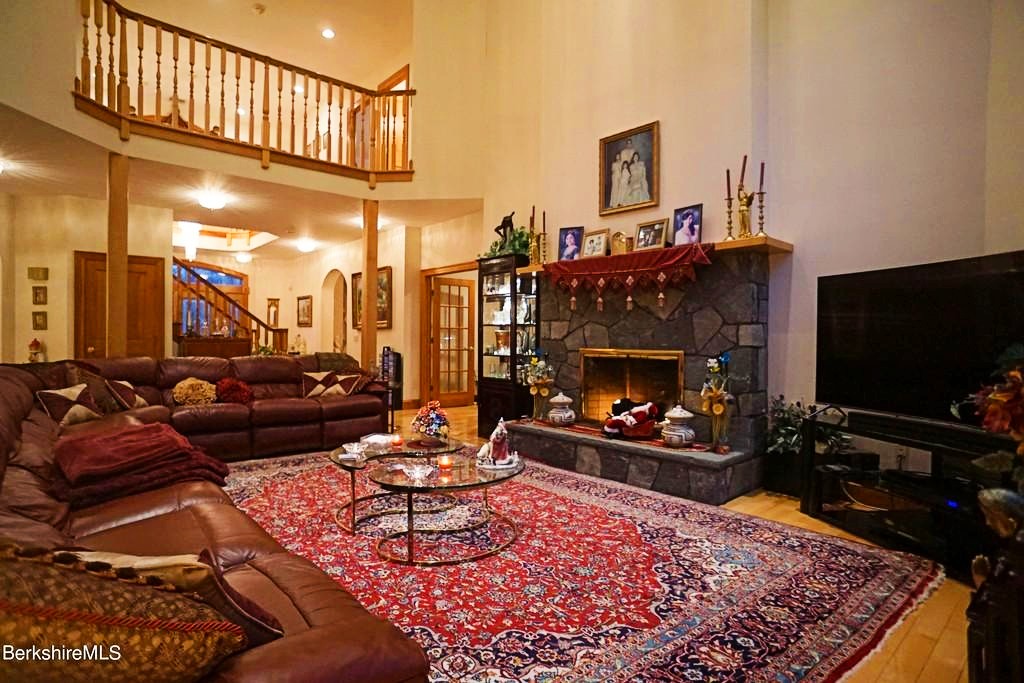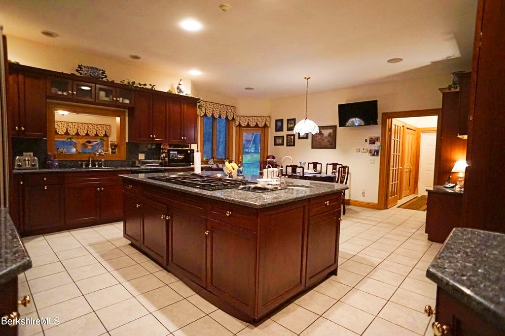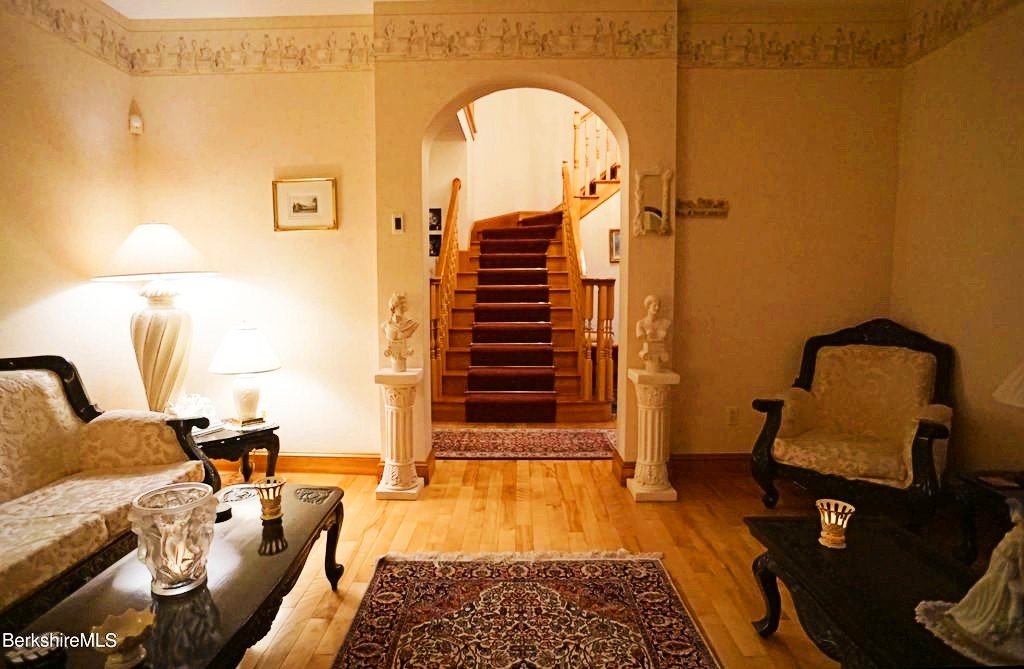 With almost 4,500 square feet, this Colonial-style home in Pittsfield has five bedrooms and four bathrooms. The marble stone foyer leads to a formal living room and family room, both bathed in light. The large, eat-in kitchen has blue chip granite counters, an extra-large kitchen isle, and walkout to the back deck. There is radian heat on the tiled floors, a central music system, and outside, landscaping and tall pines for privacy. Listed at $869,900 by All Seasons Realty Group.