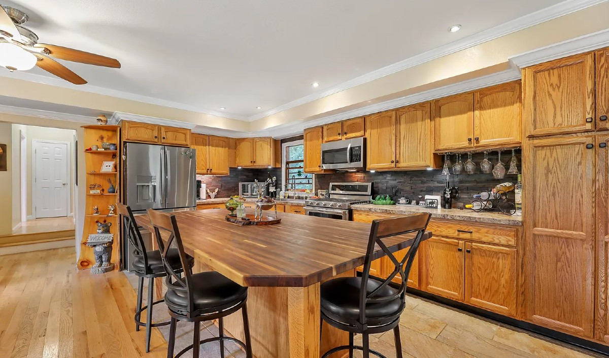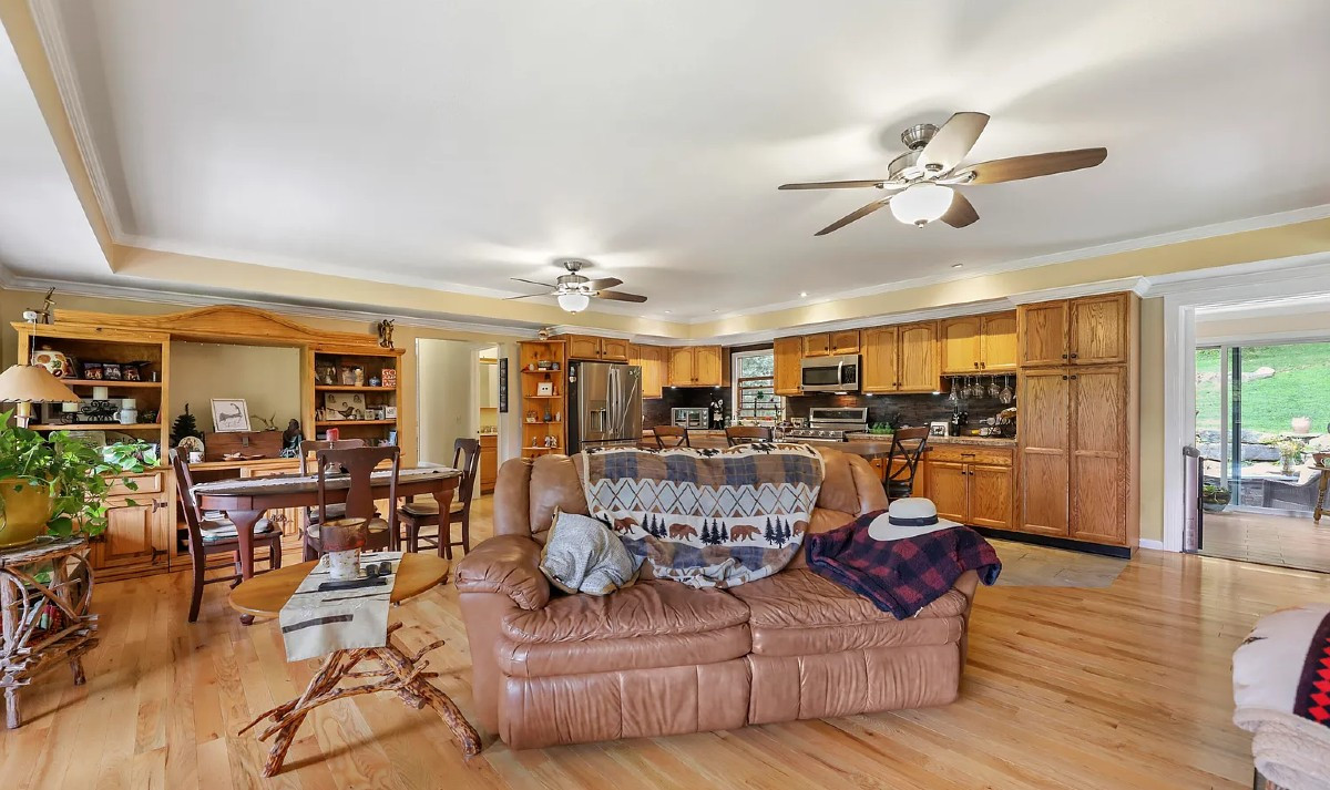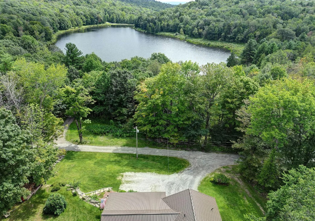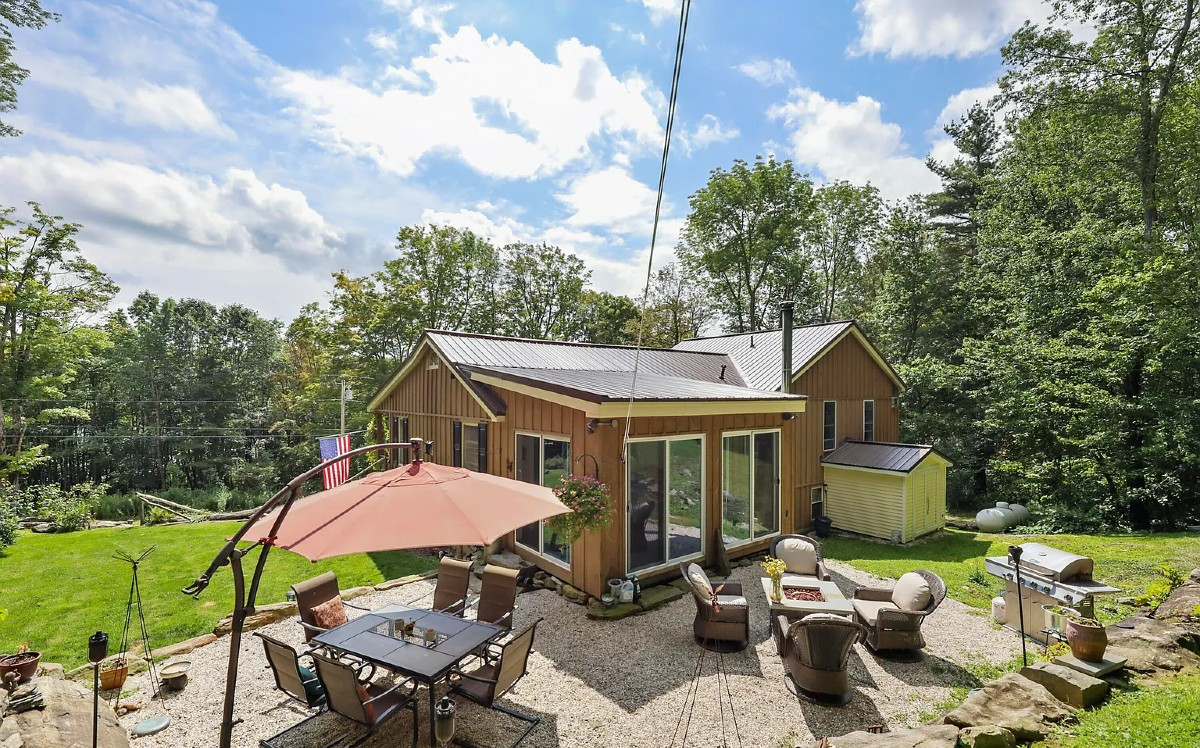 A ranch-style home in Peru offers seasonal lake views from an expansive front porch. There are three bedrooms and two bathrooms, an open-concept kitchen, dining and living room, and a four-season sunroom with wood stove. The two-car garage is heated. The exterior boasts a large patio and firepit. Listed at $459,900 by Berkshire Dream House.