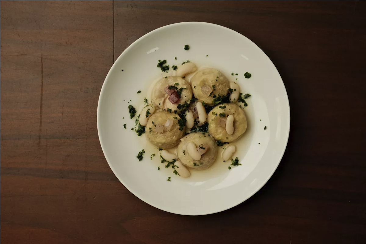 Kale gnudi—pillowy dumplings filled with a sharp ricotta-Parmesan blend—float in a delicate white bean and Parmesan broth.