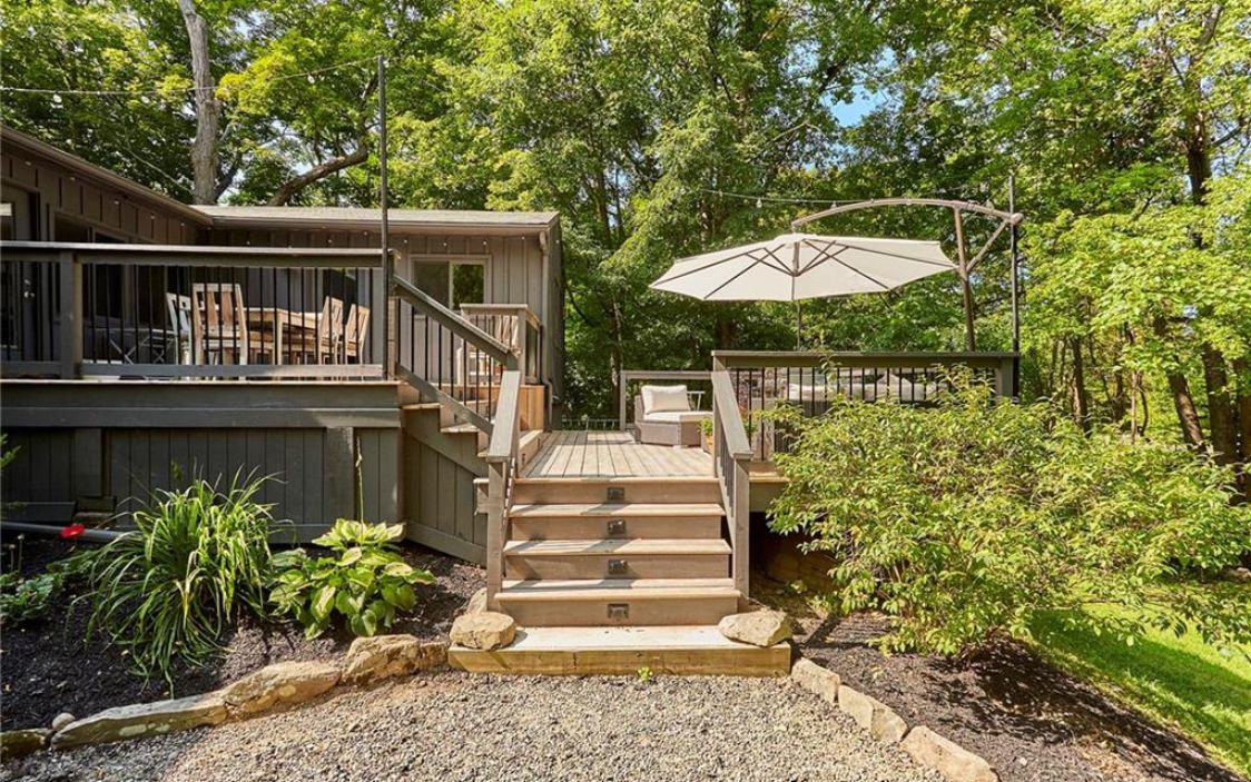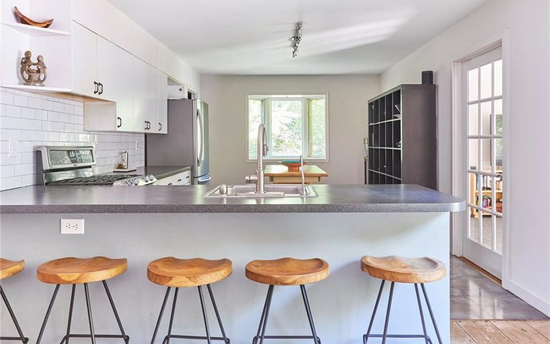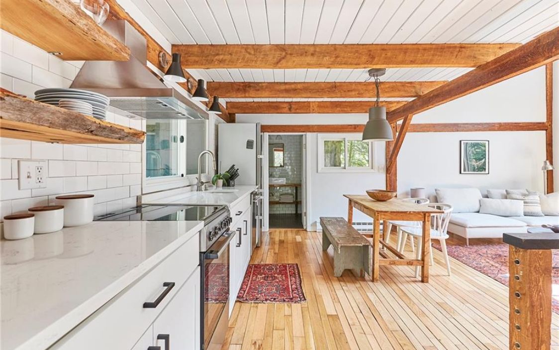 The main house of this Rhinebeck property is a large single story residence with an open concept floor plan. It has three bedrooms, a two-story deck, patio with built-in fire pit and path leading to the post-and-beam barn house. It is an 1850s converted barn with a strong airbnb history. The property is located on a long, dead-end road great for walking and biking, and just five minutes to Rhinebeck Village and Amtrak. Listed at $1,195,000 by Houlihan Lawrence.