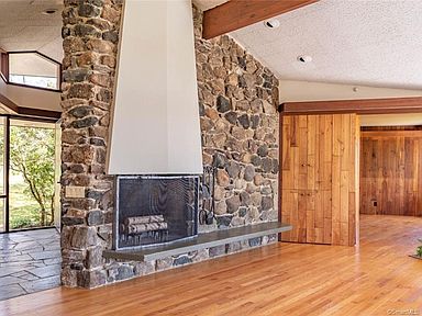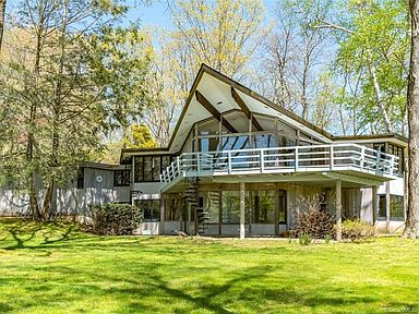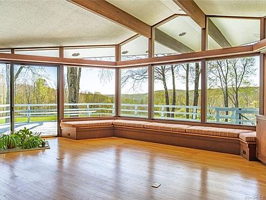 This iconic property designed by architect Tom Babbitt was built in 1970 on 61 acres in Washington. The four-bedroom, three-and-a-half bath home is surrounded by vintage stone walls, open fields, perennial planting and mature trees. The interior has an open layout. There is an overlook deck, flagstone patio, gunite pool, and a secondary structure with a squash court, indoor pool, workshop area, and garage. Listed at $3,150,000 by William Pitt Julia B Fee Sotheby's International Realty.