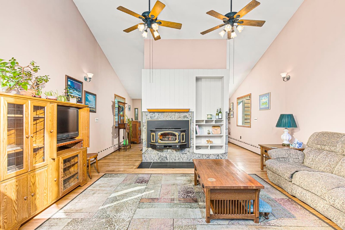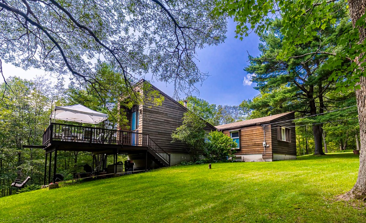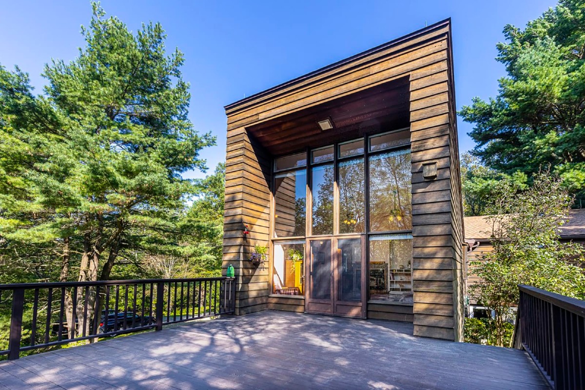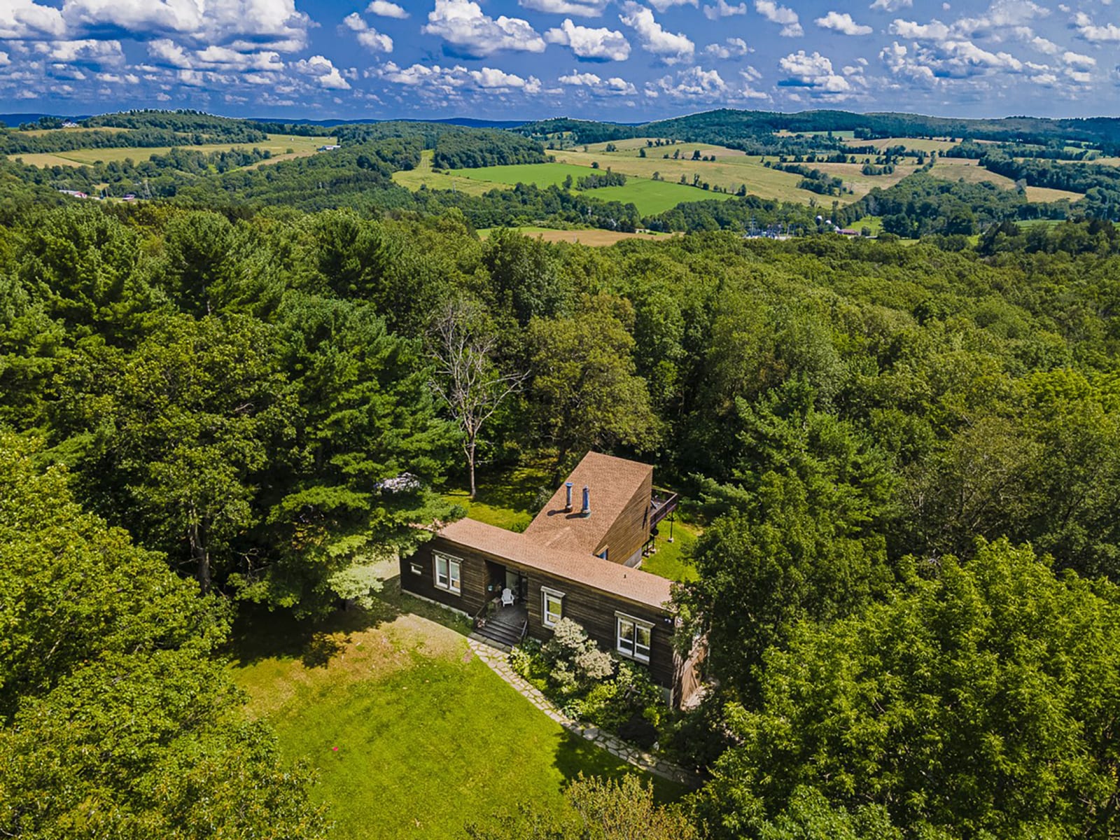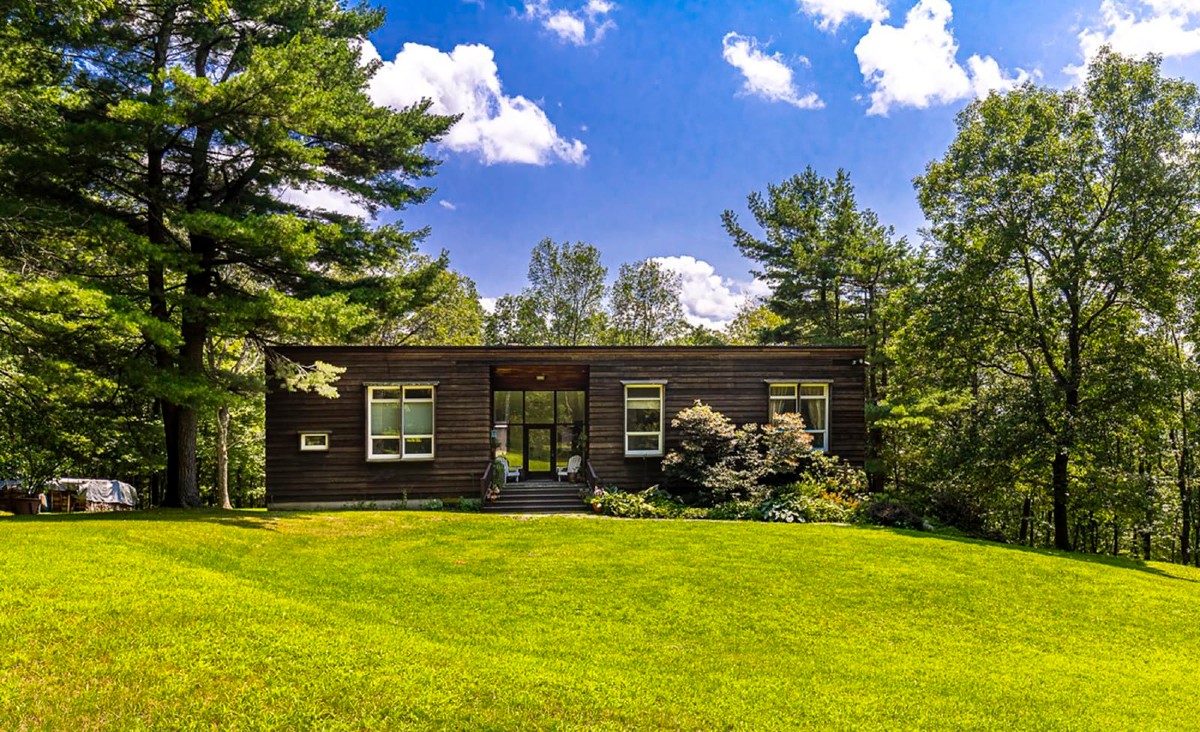 In Millerton, a mid-century modern home built in 1974 offers two bedrooms and two bathrooms on more than 10 acres. The living room features 16-feet reverse vaulted ceilings and a wall of glass that opens to an expansive deck. The basement provides an office space and a two-car garage. There is also a detached garage/barn. Located close to the Metro North train. Listed at $560,000 by Corcoran Country Living.