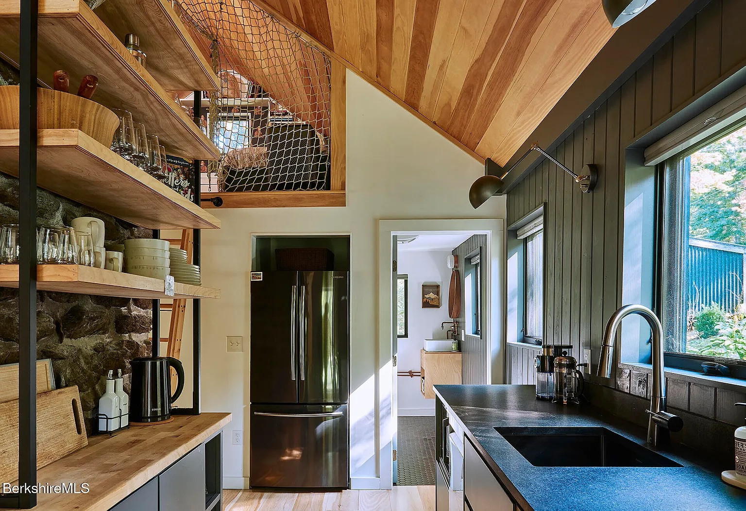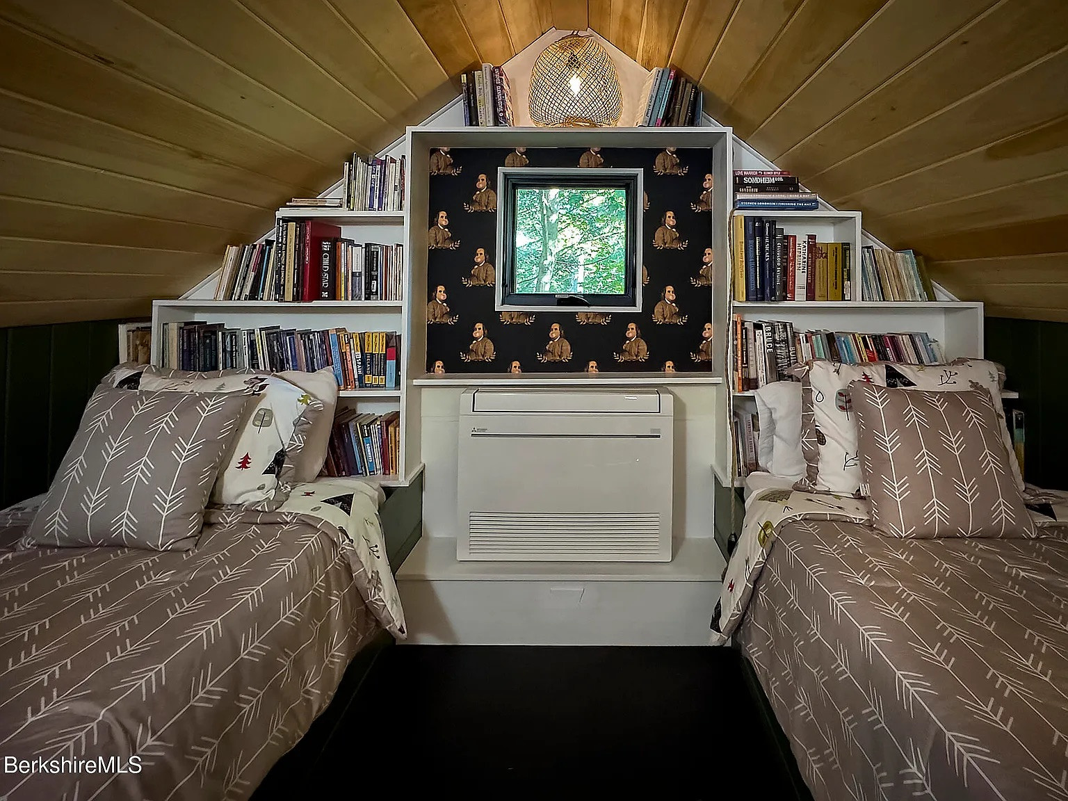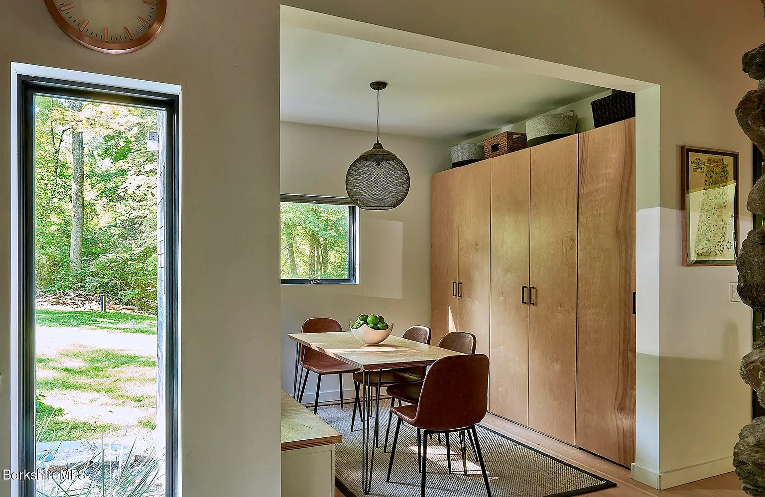 The Mahkeenac Heights neighborhood in Stockbridge keeps coming up in my searches; there are some amazing houses there, including this home at 15 Mahkeenac Heights Road. It’s a 1950 contemporary with a modern treehouse vibe, a compact 1,294 square feet on .81 acres. It includes two bedrooms, one full bath, and one half bath, all designed with clean, modern lines.