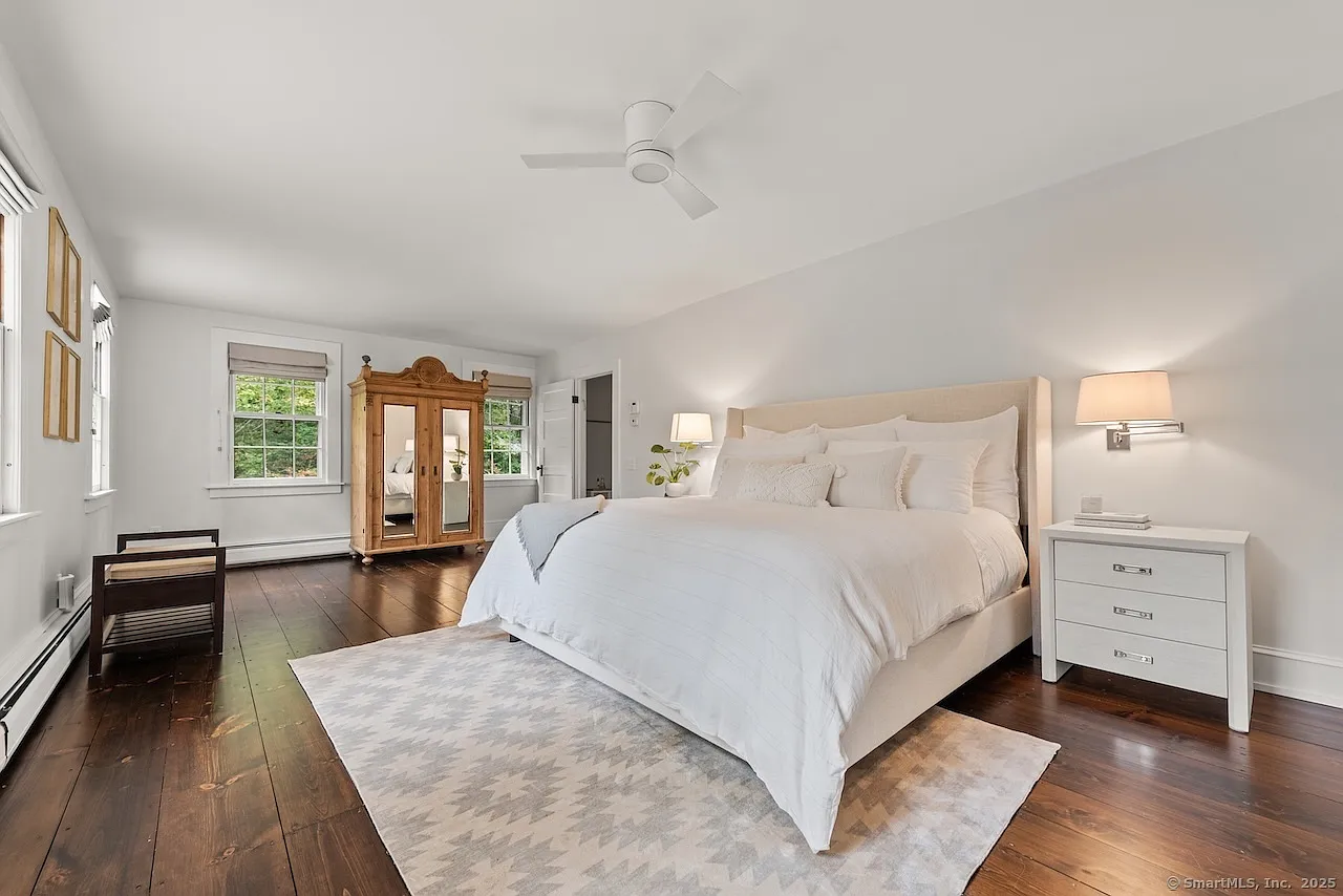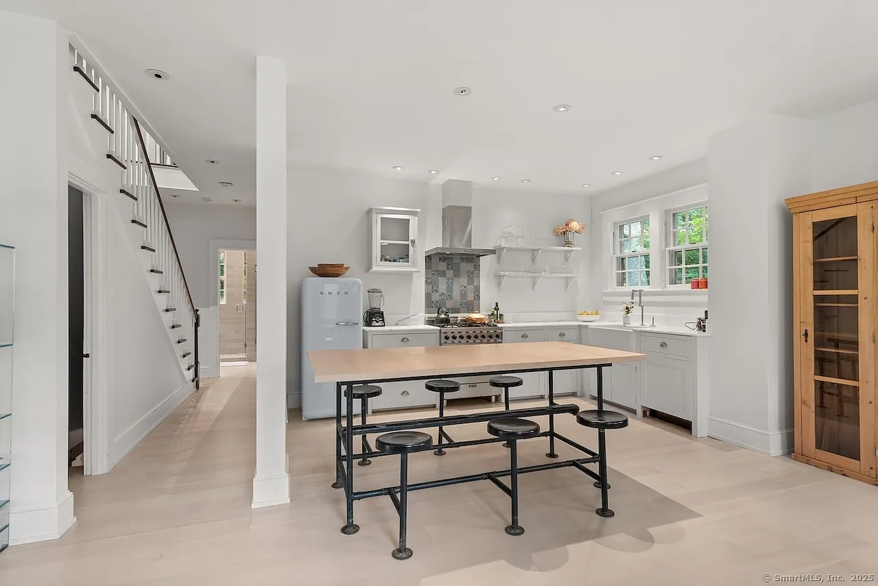 Inside, there's more of a modern feel than when this house was originally built in 1929. There are four bedrooms and two and a half bathrooms over 2,730 square feet, with light-filled common spaces and a cozy kitchen breakfast nook. One bedroom is on the ground floor and has its own ensuite bathroom. Upstairs, a home office room has its own private staircase that leads to a peaceful bonus space.
