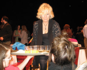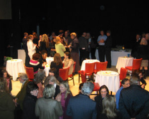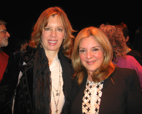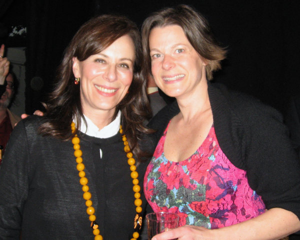 Lisa Green reports from Stockbridge. The final sold-out performance of Motherhood Out Loud at the Unicorn Theatre on Saturday, March 29, started off with a hitch that seemed to delight everybody. Technical difficulties had the production’s director, Jayne Atkinson, filling time by talking about her role on House of Cards. Finally, sound was restored, and the production, a benefit for the Berkshire Festival of Women Writers and WAM Theatre, delivered an evening of monologues exploring the experience of motherhood in all its phases. Premiered in New York by award-winning producer Susan Rose, Motherhood Out Loud has had successful productions all over the country. The Berkshires cast featured some familiar names from stage and screen including Jane Kaczmarek and Michel Gill, but there were just as many talented writers, actors and activists in the audience to match the wattage on stage. At the end of the show, champagne appeared, and like a quick scene change, the stage was transformed into a party space with drinks and hors d’oeuvres, and a lot of high energy. Above, the Festival’s director, Jennifer Browdy de Hernandez, and Kristin van Ginhoven, director of WAM.