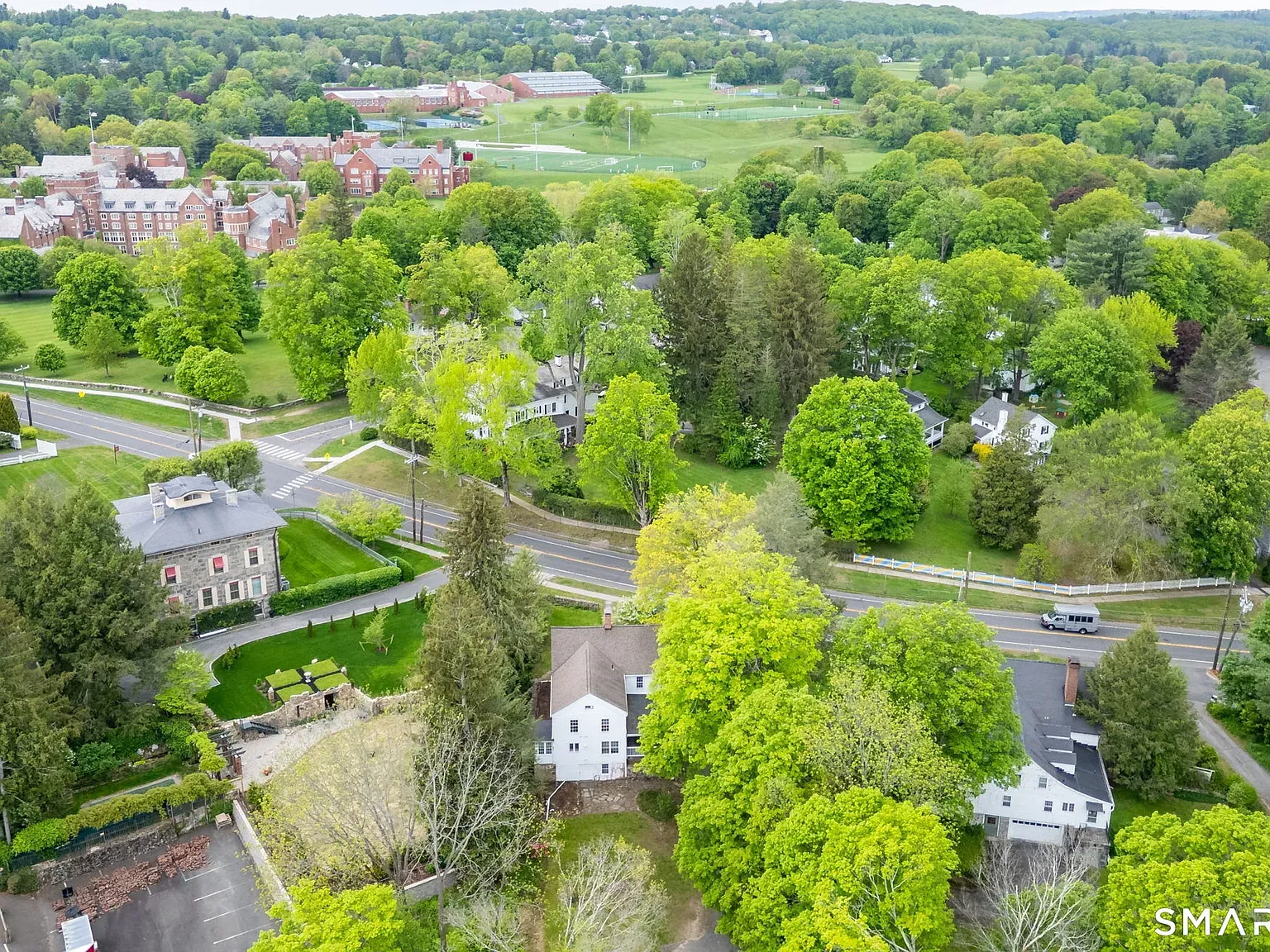 There’s a formal living room with a fireplace and a spacious dining room open to a stone patio, a family room with a second fireplace, and a sunroom off the kitchen with garden views and seasonal light. The eat-in kitchen, refreshed with newer appliances including a gas cooktop and dishwasher, balances practical function with historic charm, and an upper-level bonus room provides flexible space ideal for an office, studio, or quiet retreat.