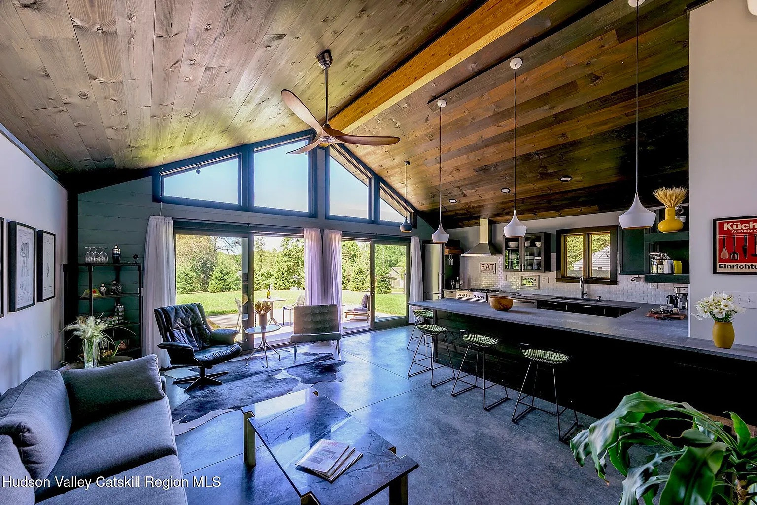Here’s a very cute new build in Hudson at 62 Tipple Road, completed in 2017 with 1,216 square feet of living space on three-quarters of an acre. It’s kind of a country contemporary, with two bedrooms and two bathrooms and an open-plan living area and kitchen with a Bertazzoni oven and Caesarstone counters, exposed beamed ceilings, and radiant-heat concrete floors.