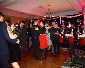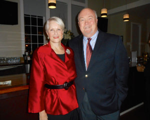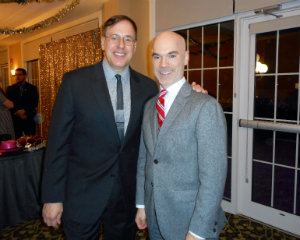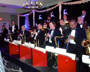 Lisa Green reports from Hadley. Whether it was the opportunity to dress up (vintage style), dance to a traditional big band or meet the faces behind the mics, New England Public Radio listeners showed their support at the radio station’s second annual “Jazz Holiday Party” on Saturday, Dec. 10 at the Hadley Farms Meeting House. Hovering over the party were the spirits of Frank Sinatra and Ella Fitzgerald, who came to life through singers Rob Zappulla and Dawning Holmes, as they covered the tunes of the two jazz legends backed by the 18-piece Jeff Holmes Big Band. All proceeds from the evening will go directly to supporting the programs and services of NEPR. [Above, the station's CEO and General Manager Martin Miller and Pete Sokolowski, substitute jazz host.]